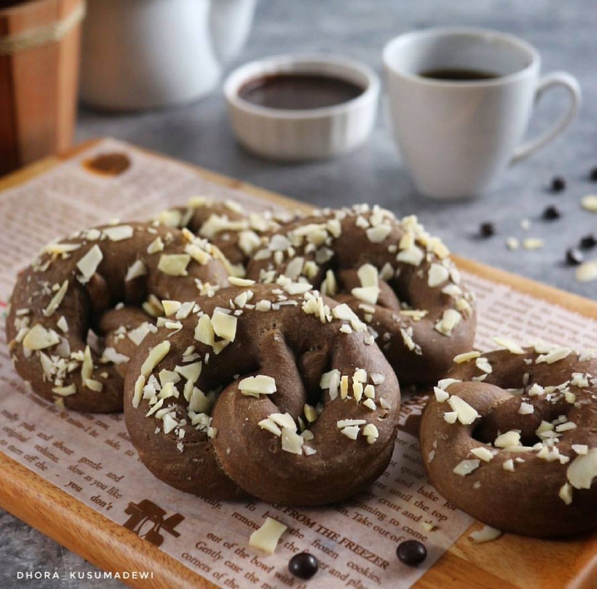 Pretzel merupakan salah satu camilan yang berasal dari Jerman. Biasanya, pretzel memiliki bentuk yang unik, seperti simpul. Makanan ini telah menjadi populer di berbagai negara, termasuk Indonesia, dan sering disajikan dengan berbagai saus, atau bisa juga dimakan langsung. Kali ini, kita akan membuat Pretzel Moka Almond yang kenyal dengan tambahan rasa moka dari kopi dan cokelat. Yuk, ikuti langkah-langkahnya!