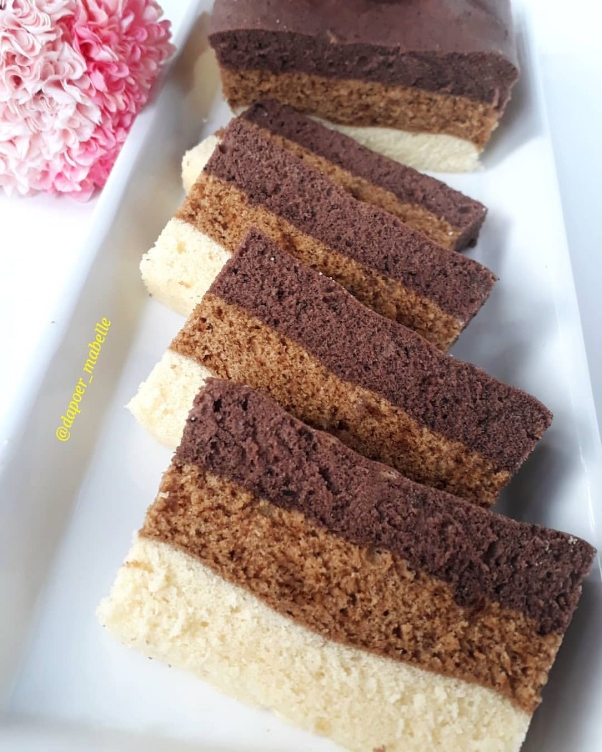 - Tuang adonan putih ke dalam loyang, kukus selama 10 menit. Setelah itu, tuang adonan kopi dan kukus lagi selama 10 menit. Terakhir, tuang adonan coklat dan kukus selama 20 menit lagi. Angkat dan dinginkan.