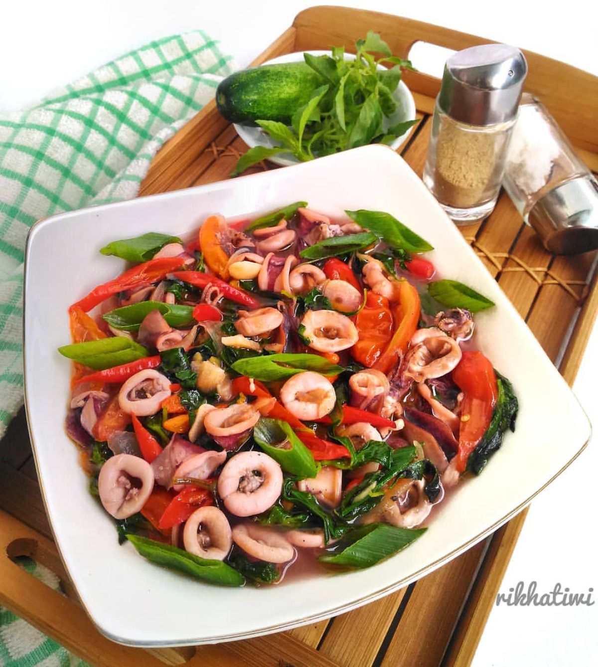 Cumi Kemangi adalah hidangan yang sederhana namun kaya rasa. Cumi-cumi yang segar dipadukan dengan daun kemangi dan aneka cabai menjadikan makanan ini penuh warna dan menggugah selera. Cita rasa pedas dan aroma segar dari kemangi membuat hidangan ini sangat menggoda untuk dicoba!