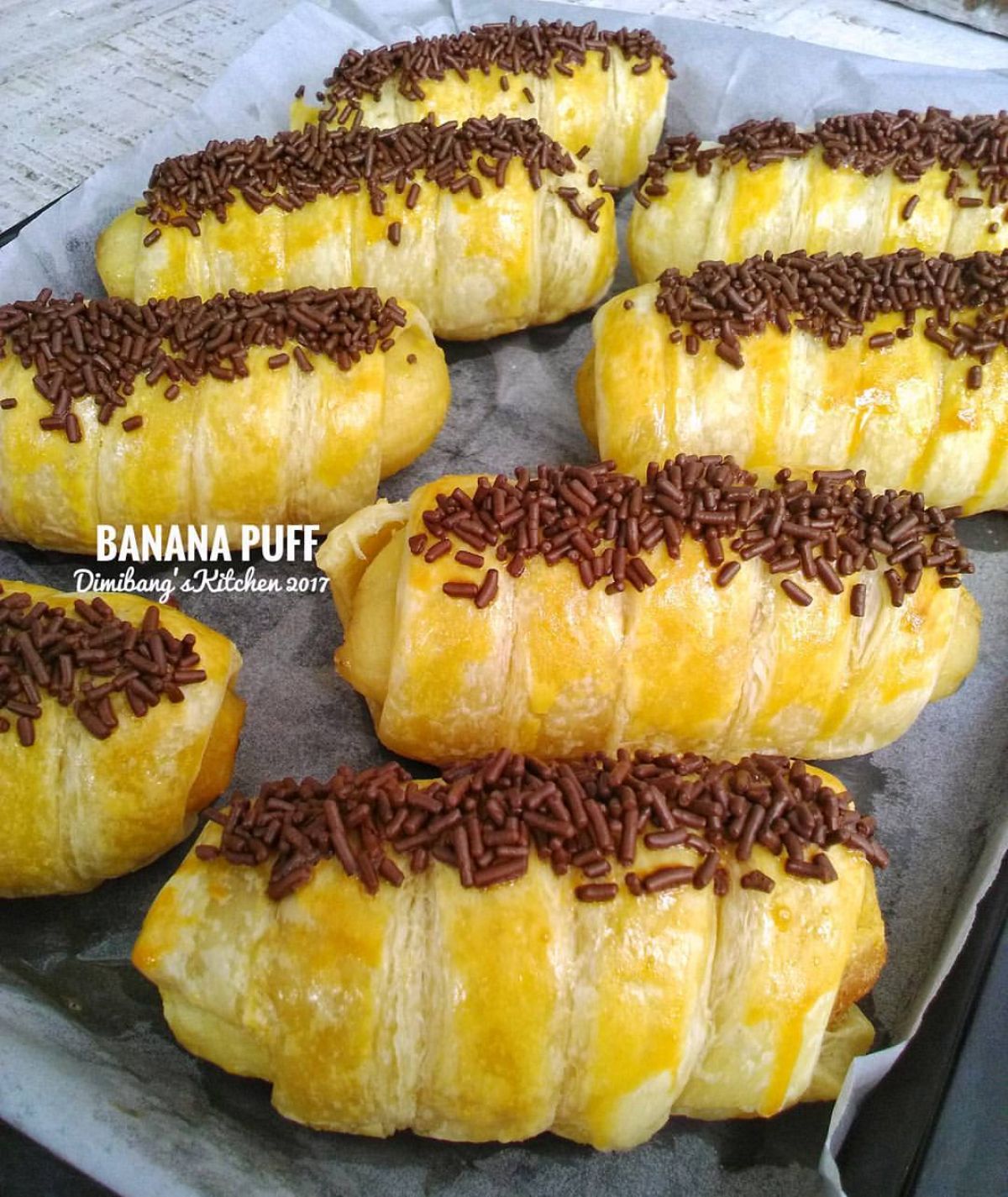 - Siapkan loyang, olesi dengan margarin dan letakkan kertas roti di atasnya. Letakkan banana puff yang telah dililit pada pisang di atas loyang tersebut.