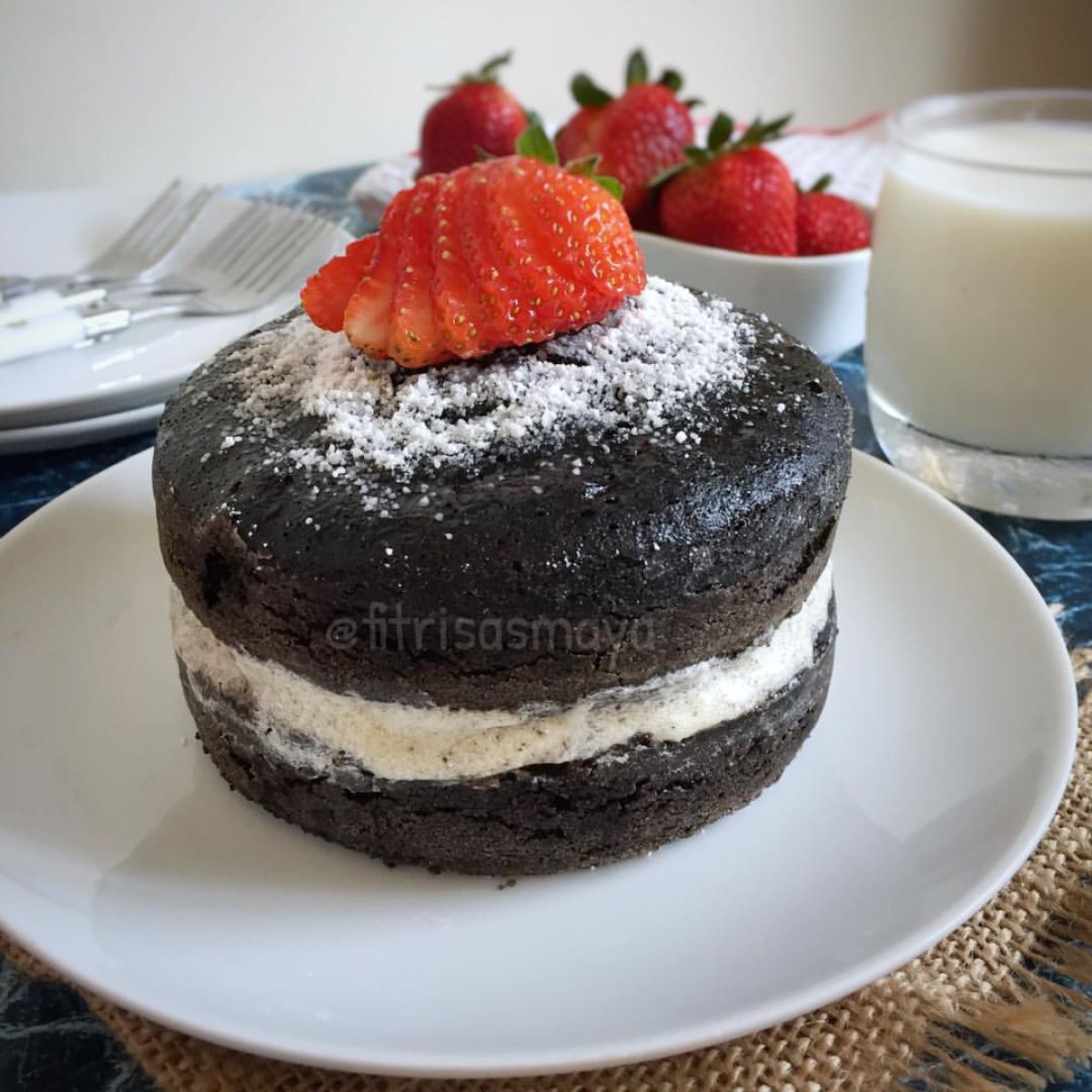 - Ambil satu buah cake, oleskan cream cheese di atasnya, lalu tutup dengan cake yang satunya lagi. Taburi dengan gula halus agar lebih cantik saat disajikan.