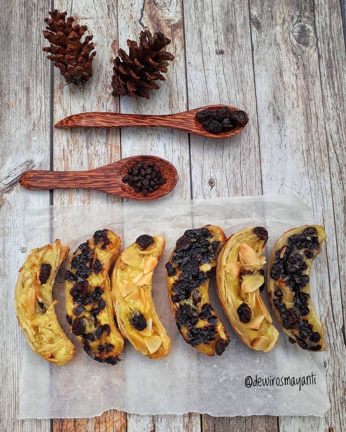 - Isi dengan Pisang: Letakkan potongan pisang yang sudah matang di dalam kulit pastry. Guyur dengan isian cair sampai hampir penuh. Tambahkan kismis dan topping lainnya seperti choco chip, almond, dan keju sesuai selera.