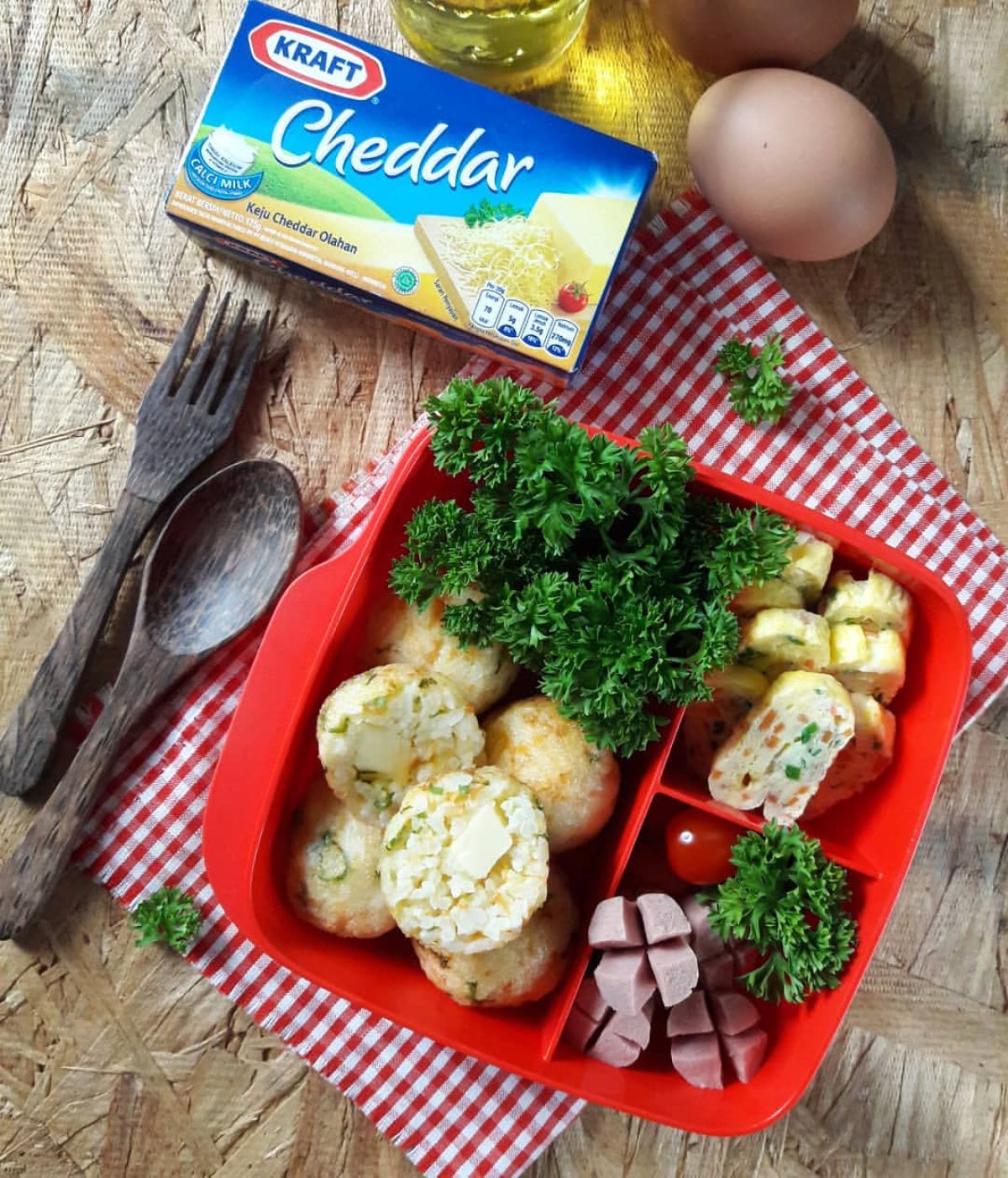 Kita bisa menyajikan nasi kepal goreng dan telur dadar sayur keju di dalam kotak bekal. Bisa juga ditambahi dengan irisan tomat atau mentimun untuk rasa segar.