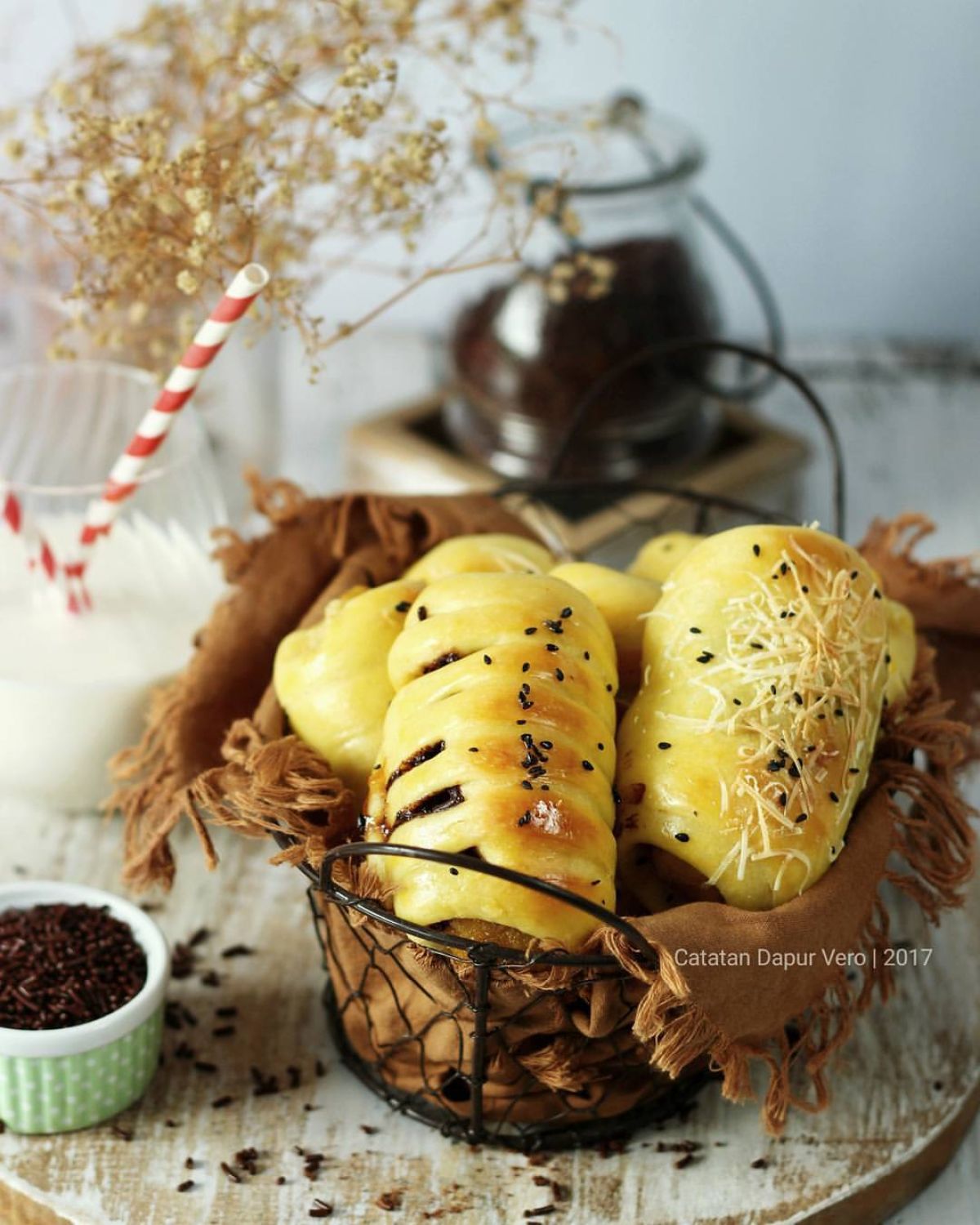 - Diamkan roti yang sudah digulung selama 30 menit hingga mengembang. Olesi permukaan roti dengan campuran kuning telur dan susu cair, lalu taburi dengan keju parut dan wijen hitam.