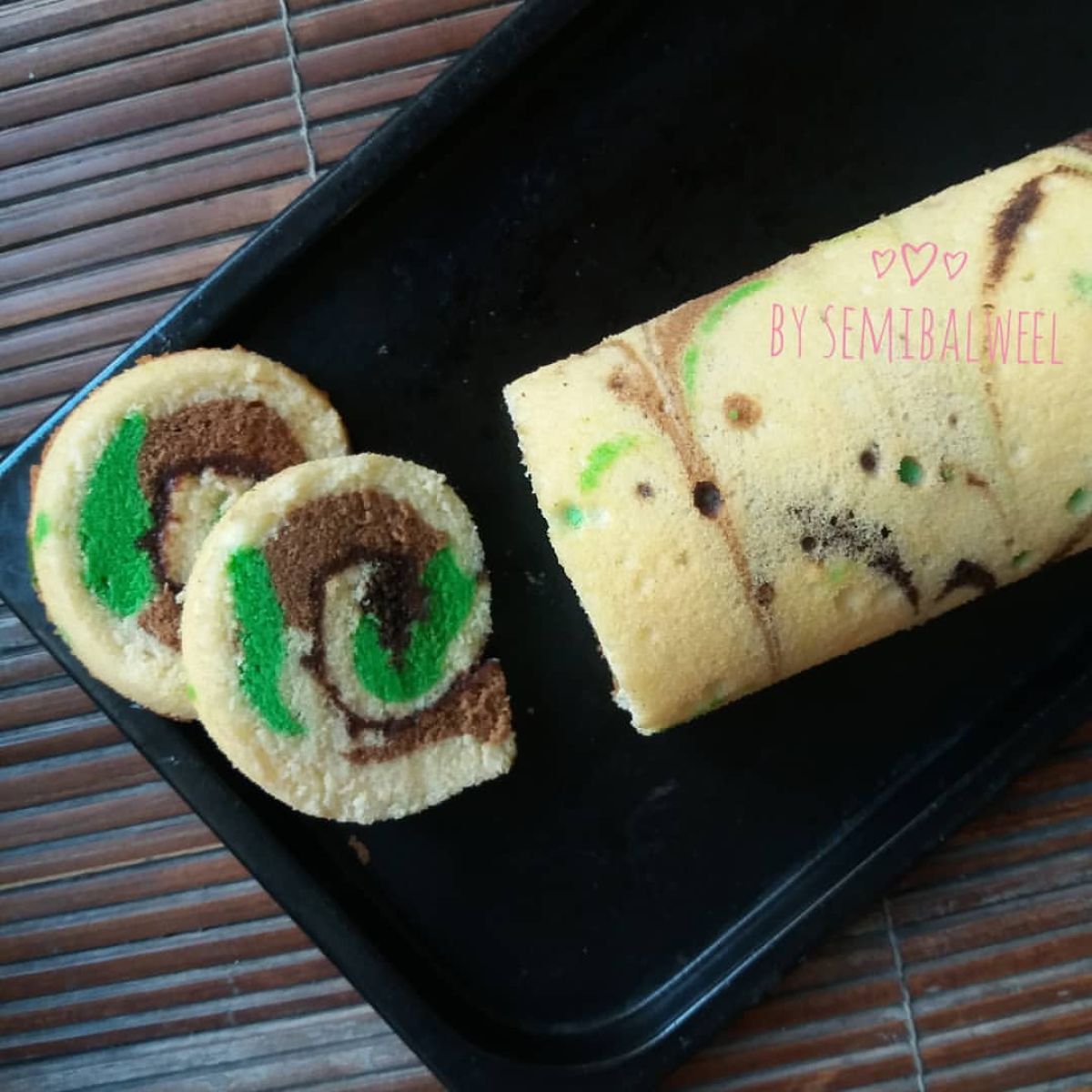 - Setelah matang, balik kue pada kertas roti yang bersih, beri selai coklat di atasnya, lalu gulung perlahan.