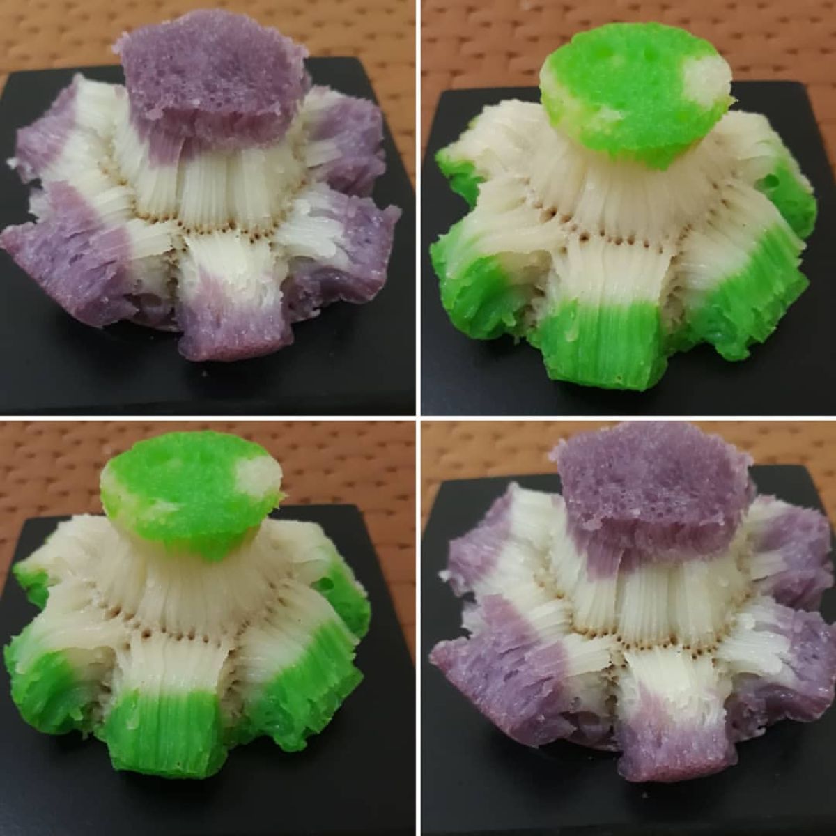 9. Tuang adonan ke dalam cetakan, mulai dengan satu warna, kemudian disusul dengan warna yang lain. Kecilkan api dan biarkan hingga matang.
