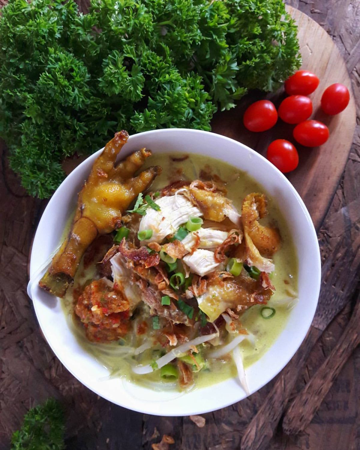 - Taburi dengan irisan daun bawang, daun seledri, tomat, dan bawang goreng. Soto Medan siap dinikmati!