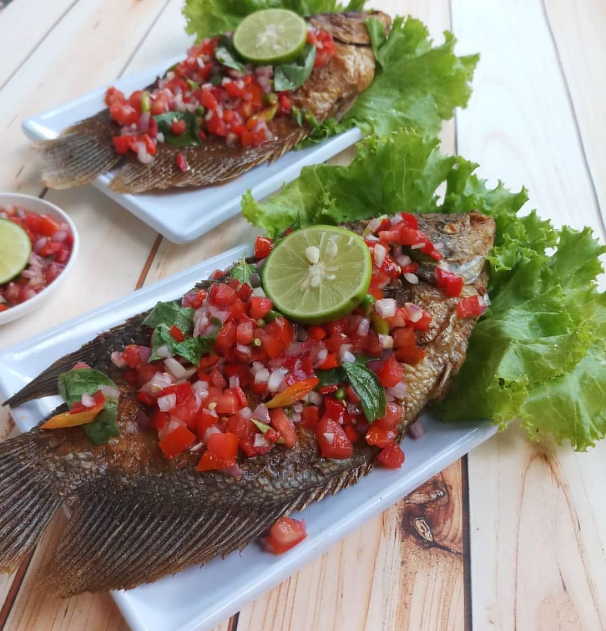 - Letakkan ikan gurame yang sudah digoreng di atas piring saji. Siramkan sambal dabu-dabu di atasnya. Jika kamu suka, bisa menambahkan daun kemangi. Selamat menikmati!