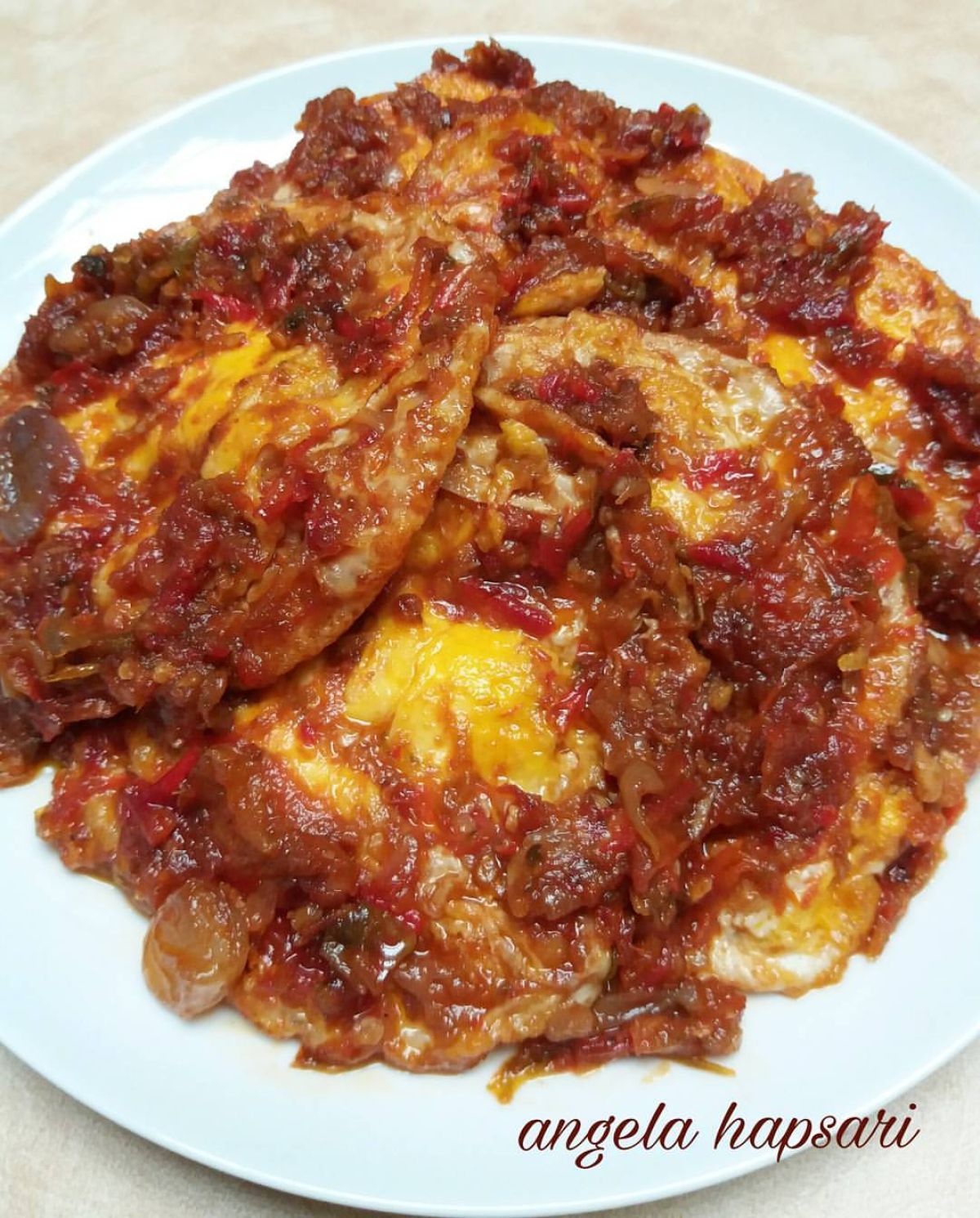- Masukkan telur ceplok ke dalam sambal, aduk pelan agar tidak hancur. Tunggu hingga air sambal menyusut dan koreksi rasa. Jika sudah pas, angkat.