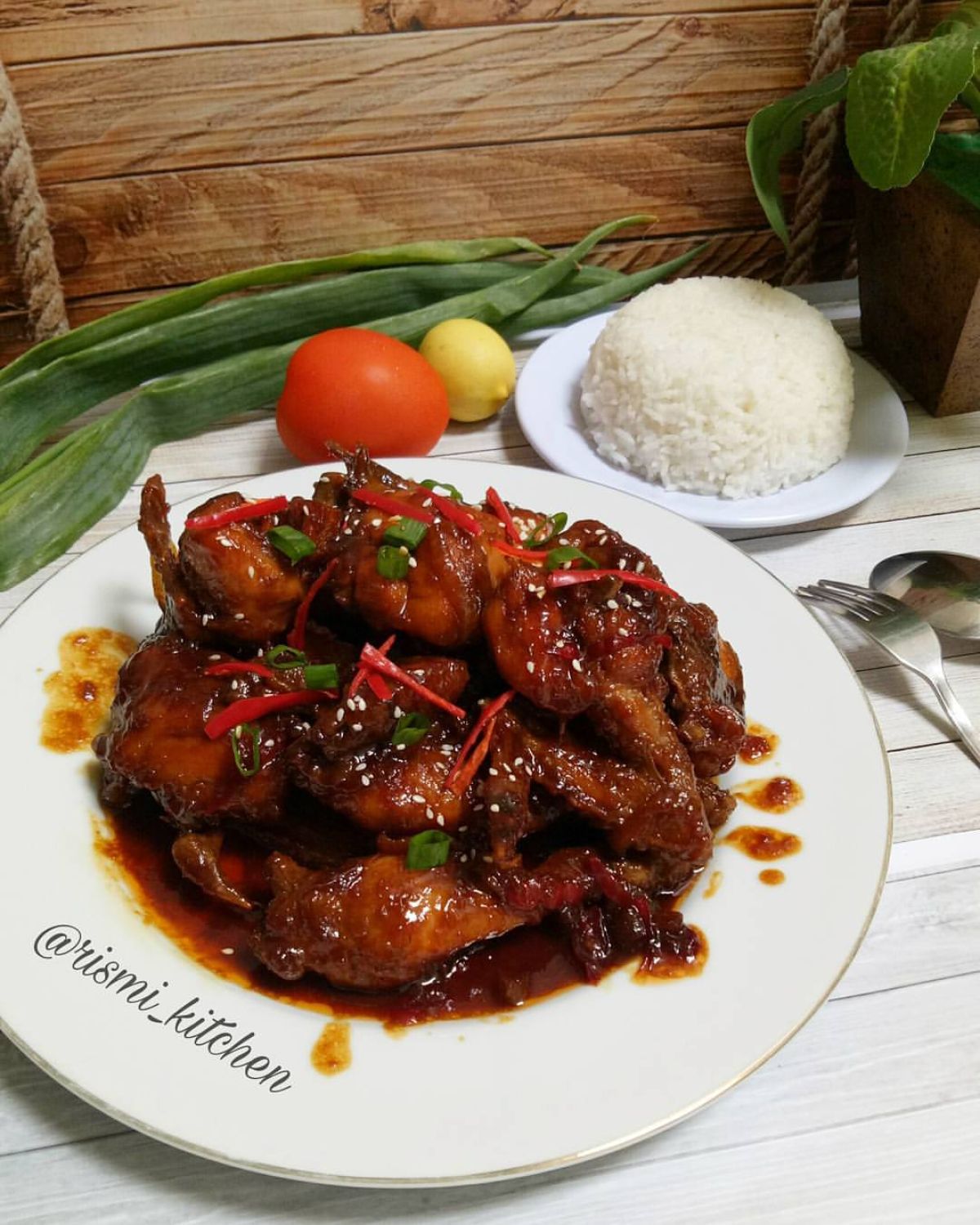 5. Sajikan ayam kecap tersebut di atas piring, hias dengan irisan daun bawang, cabe iris, dan taburan biji wijen. Selamat menikmati!
