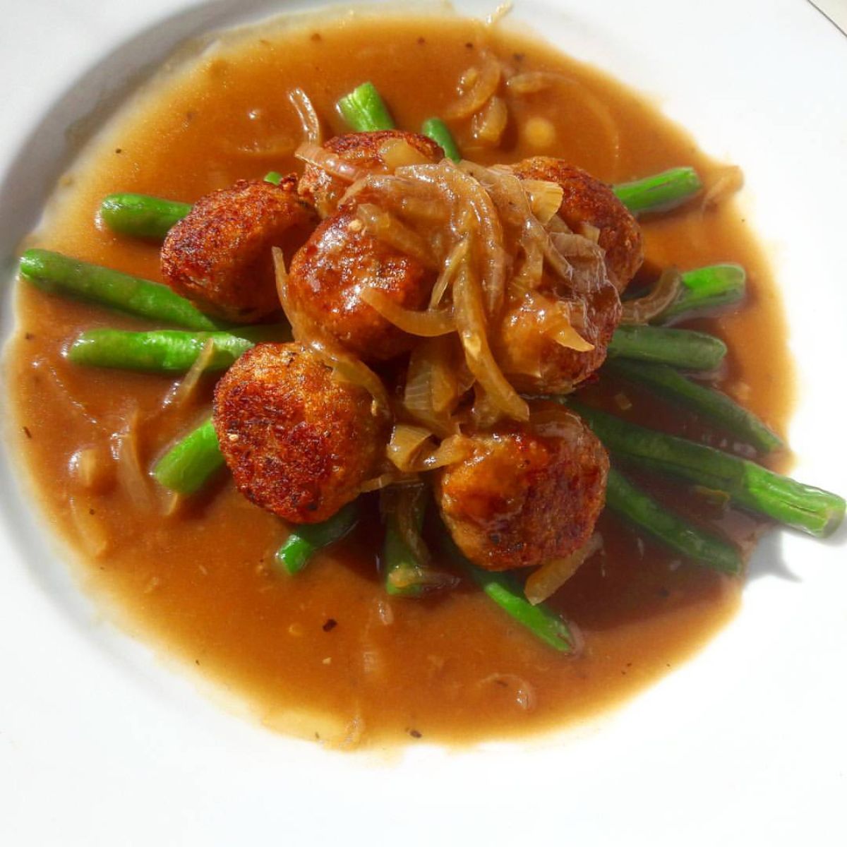 - Sajikan bola jamur hangat bersama sayuran rebus, seperti buncis, dan saus kental.