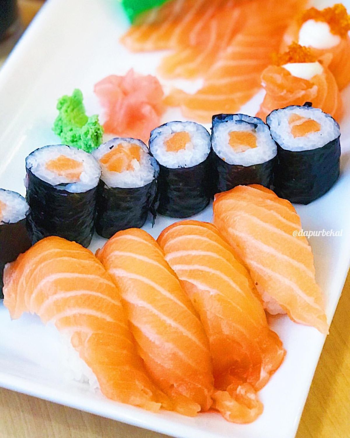 - Atur sashimi: Susun irisan salmon di atas daun shiso atau selada dengan rapi. Usahakan untuk menata dengan cara yang cantik agar terlihat menggugah selera.