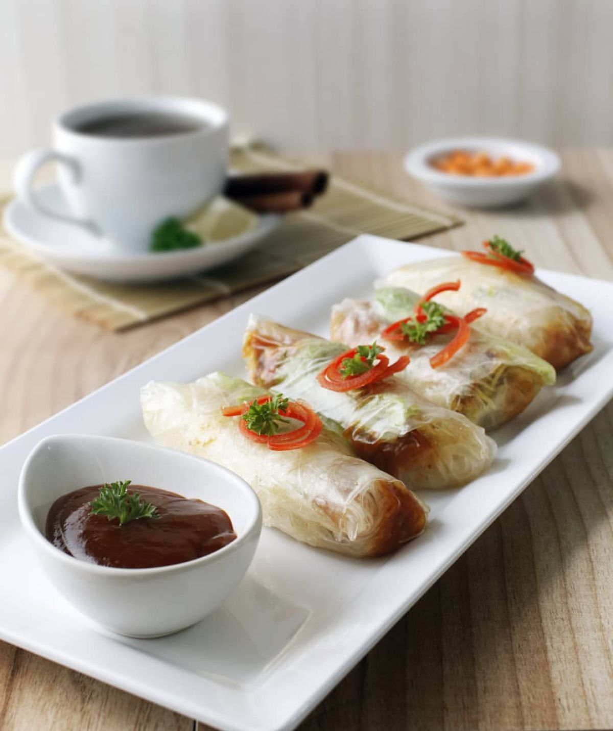 - Ambil satu lembar paper rice, celupkan sebentar dalam air hingga cukup lunak. Letakkan paper rice di atas piring. Tambahkan bihun di bagian bawah, potongan timun, daun selada, 1 sdm saus, dan 3-4 irisan ayam di atasnya.