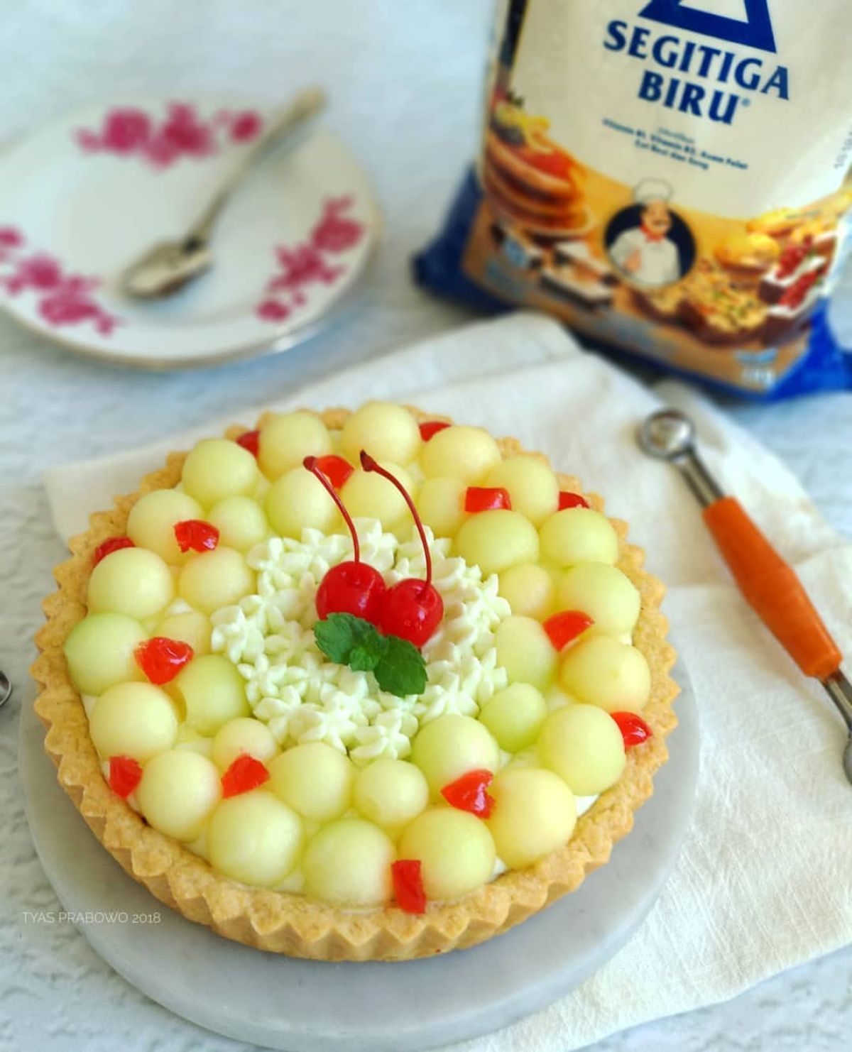 4. Semprotkan Filling: Setelah crust sudah dingin, semprotkan filling yang telah dibuat ke dalam kulit pie hingga penuh. Atur potongan buah melon dan manisan ceri di atasnya sebagai topping.