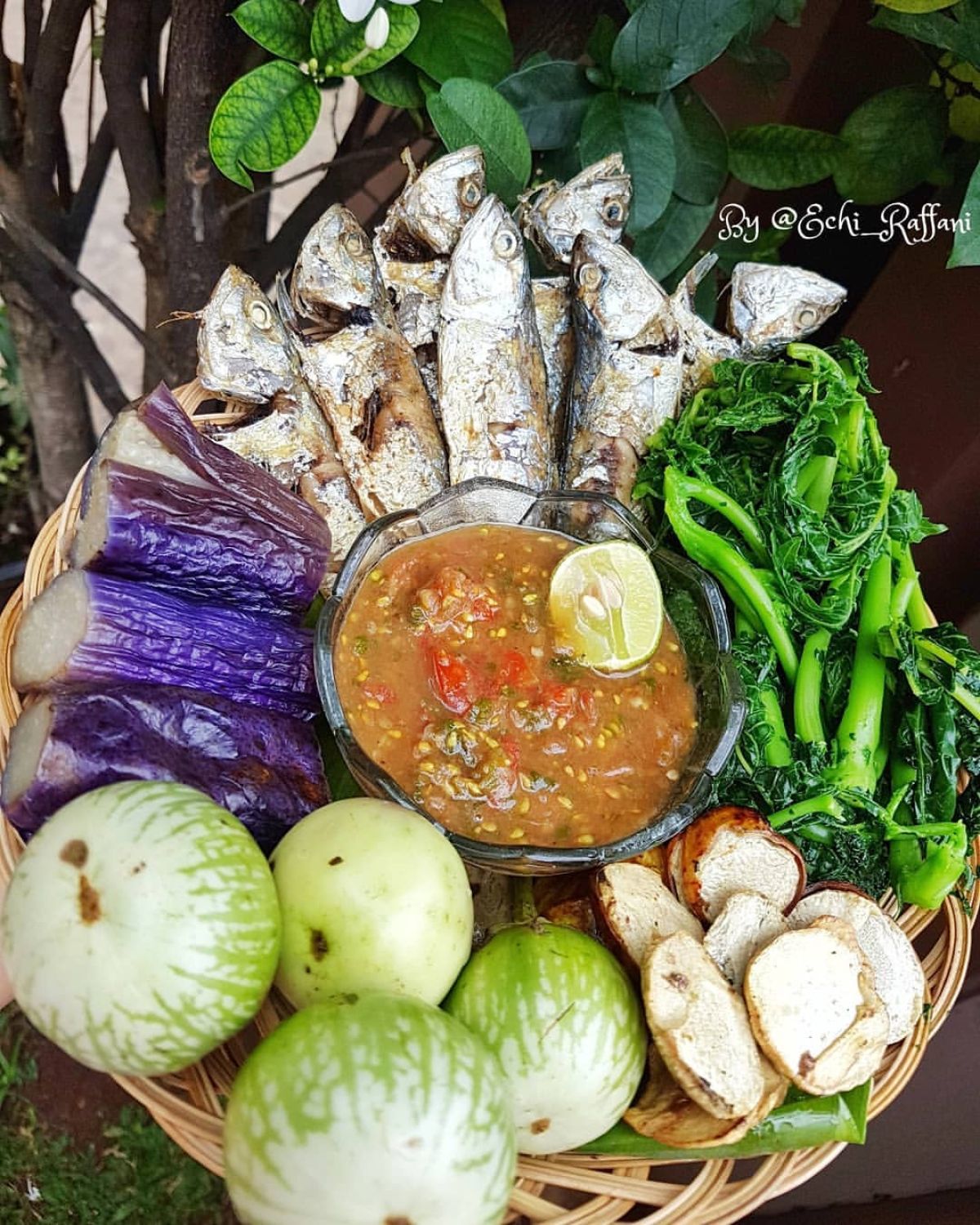 - Siapkan semua hidangan di piring. Taruh ikan goreng di atas piring, tambahkan daun pepaya, terong, dan jengkol goreng. Sajikan sambel terasi di sampingnya.