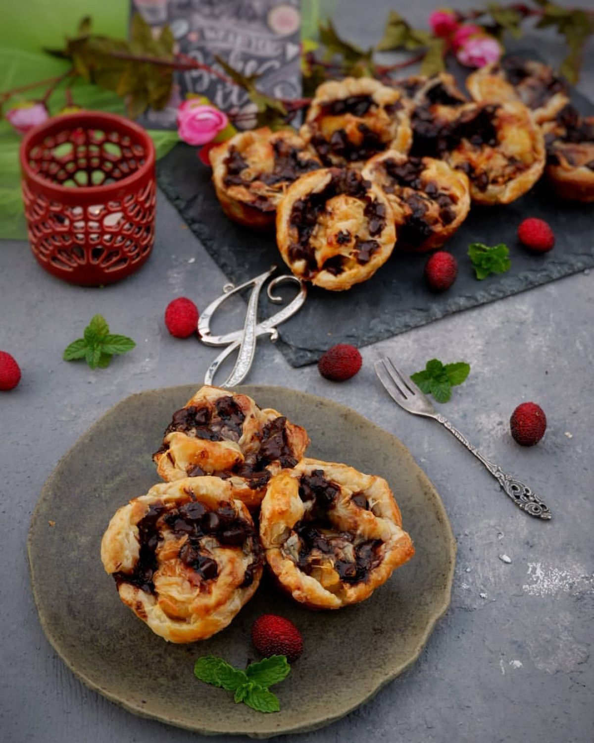 - Isi setiap cetakan puff pastry dengan potongan pisang goreng, taburi dengan keju serut dan chocolate chips di atasnya.