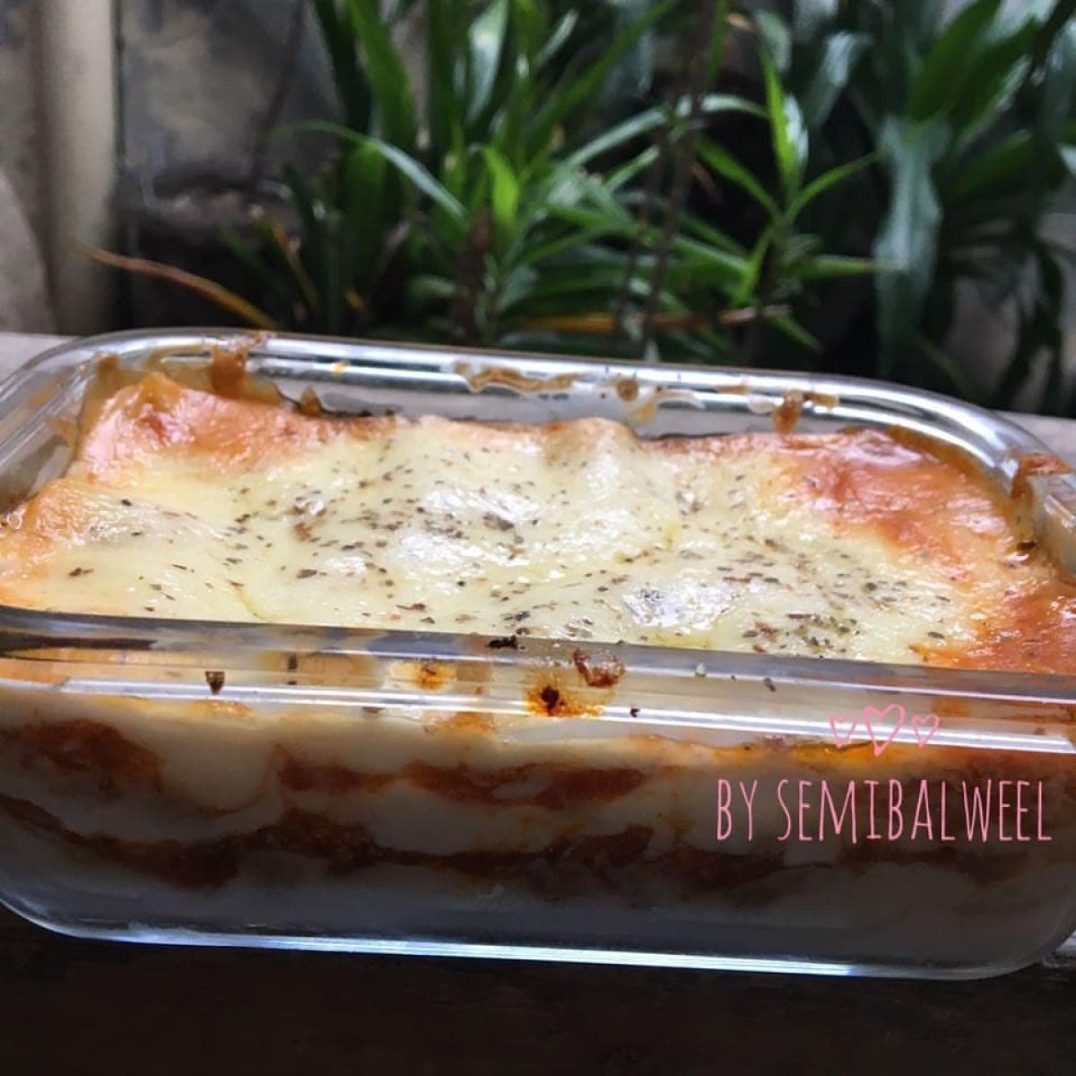 - Ulangi langkah ini hingga semua bahan habis, dengan lapisan terakhir adalah saus putih dan taburan keju mozzarella.