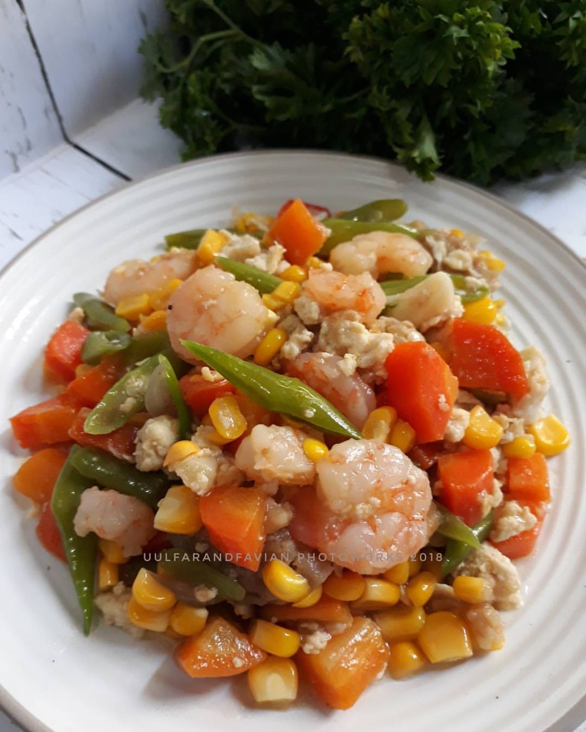 - Angkat sayuran yang sudah direbus dan masukkan wortel, buncis, dan jagung pipil ke dalam wajan. Tambahkan sedikit air agar tidak terlalu kering, lalu aduk rata.