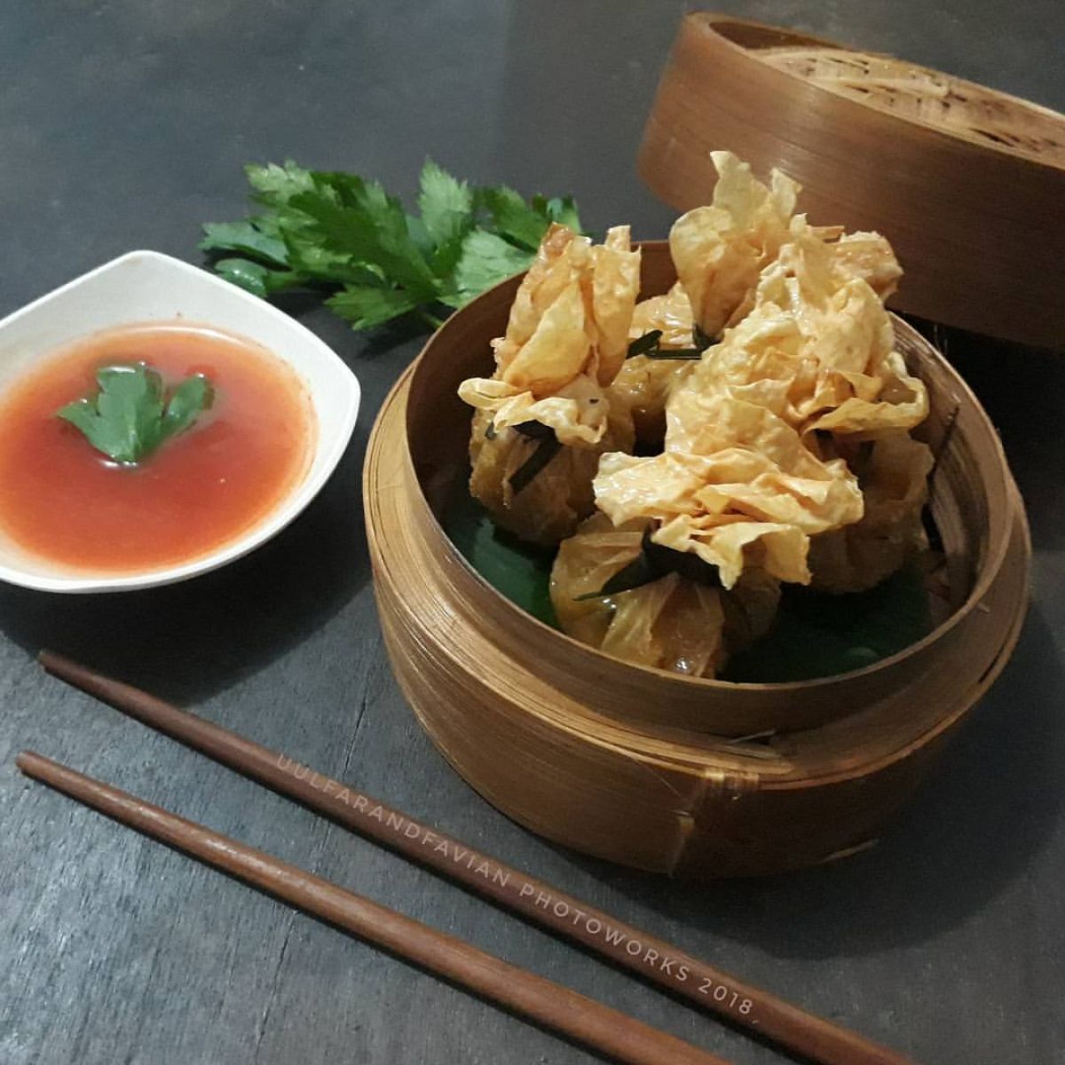 - Isi setiap kulit dengan satu sendok adonan daging udang, lalu masukkan telur puyuh rebus ke tengah adonan. Ikat menggunakan kucai dan bentuk menyerupai pundi-pundi. Ulangi hingga adonan habis.