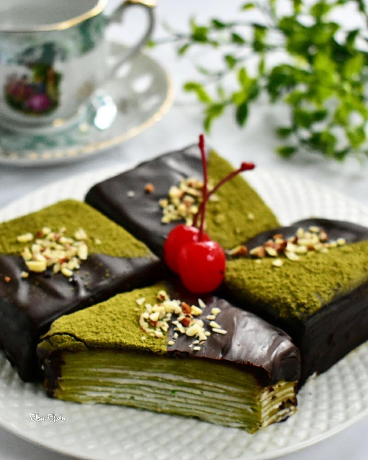 - Menghias : Siram potongan crepe cake dengan coklat leleh di atasnya, lalu bekukan sebentar. Taburkan matcha bubuk dan kacang almond cincang sebagai hiasan. Selesai, Matcha Crepe Cake siap disajikan!