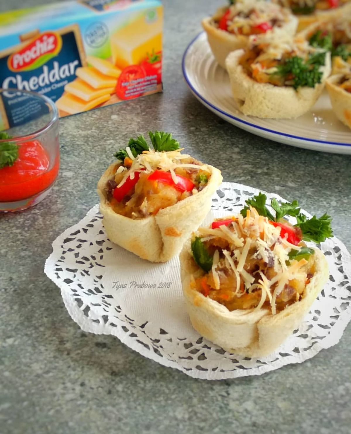 - Ambil setiap bulatan roti tawar yang sudah dipipihkan dan taruh di dalam cetakan kecil. Isi bagian tengahnya dengan ragout yang sudah dimasak. Taburi di atasnya dengan keju parut.