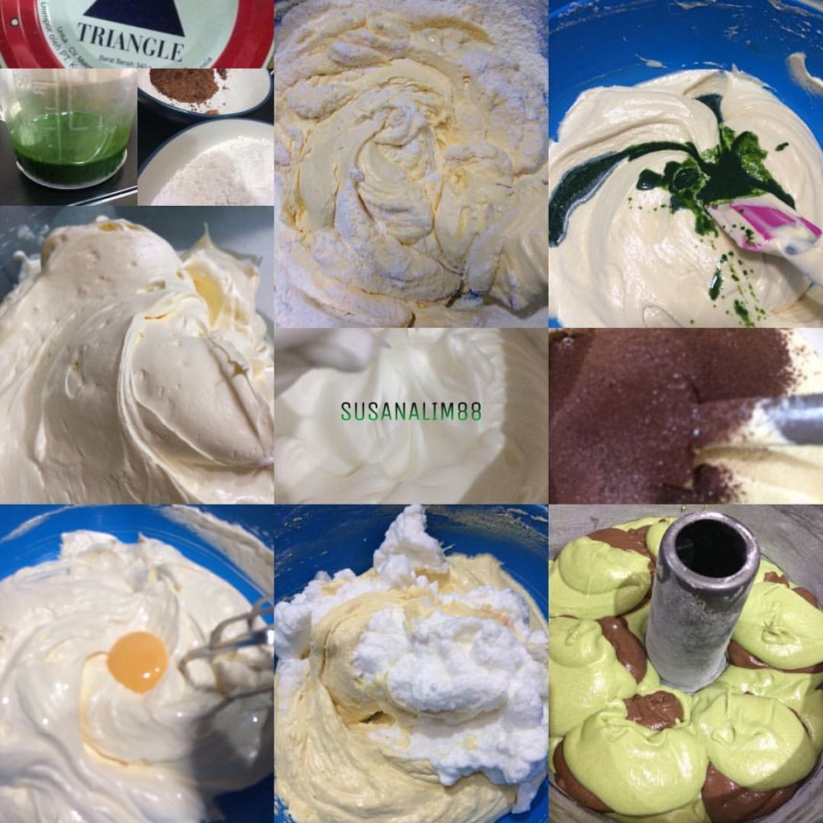 - Tuang adonan pandan secukupnya ke dalam loyang, kemudian tuang adonan coklat di atasnya. Ulangi hingga semua adonan habis.