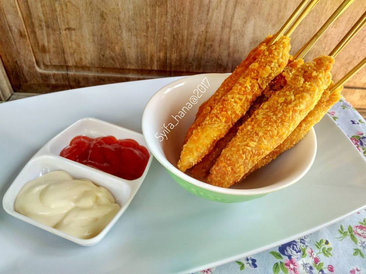 - Tusuk potongan ayam yang sudah dilapisi tepung panir ke tusuk sate. Lakukan hingga semua ayam habis.
