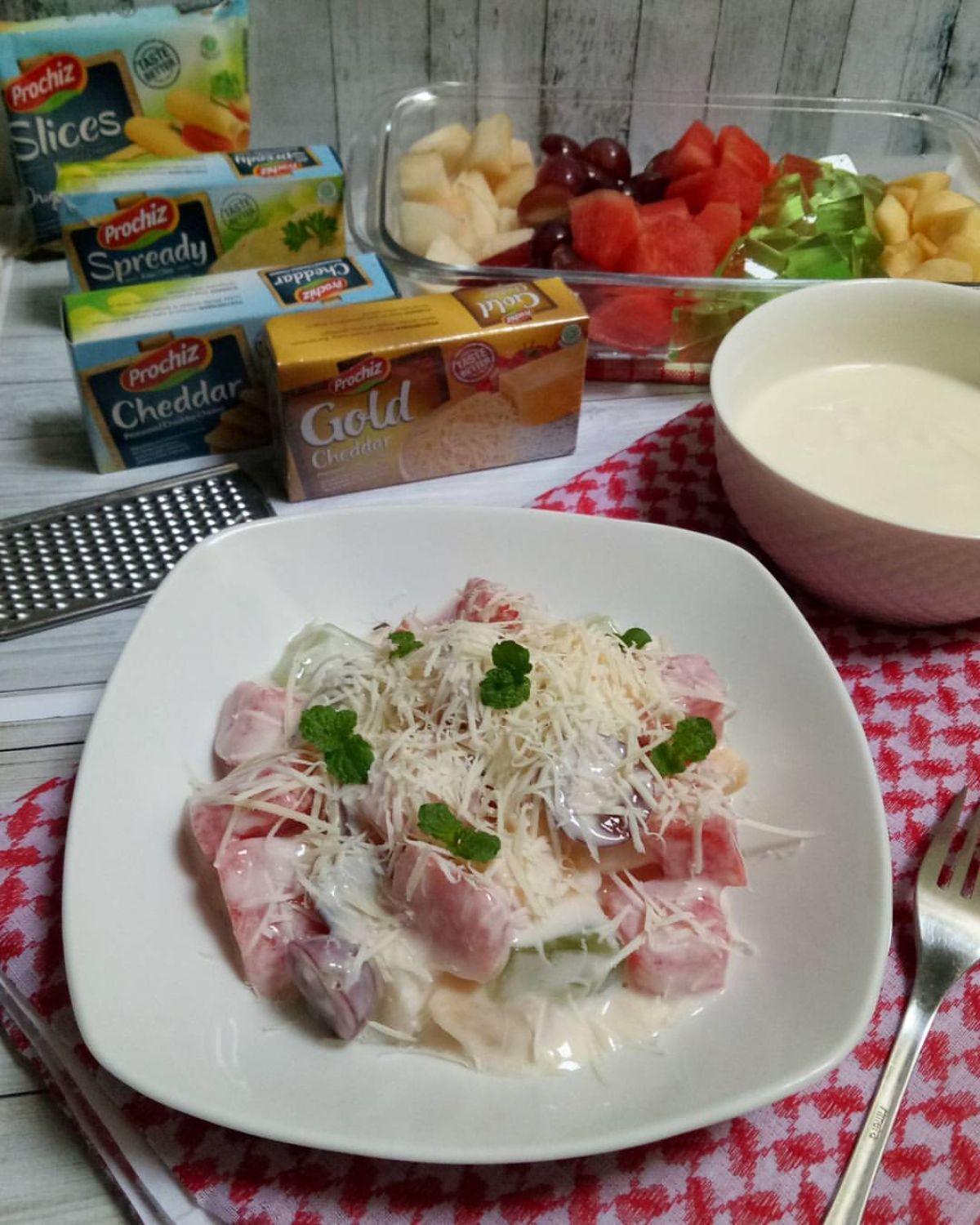 - Tuang dressing di atas buah-buahan dan jelly. Taburkan parutan keju Prochiz Cheddar di atasnya.