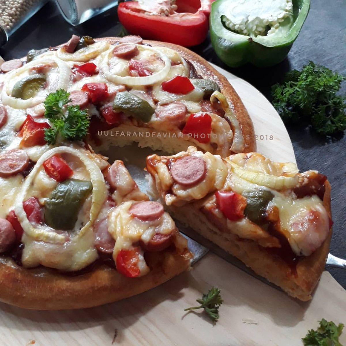 1. Mengoles Saus: Olesi bagian atas adonan yang sudah matang dengan saus pizza. Kemudian taburkan topping sesuai selera seperti saus bolognaise, sosis, daging asap, irisan bawang bombay, paprika, dan keju mozzarella.