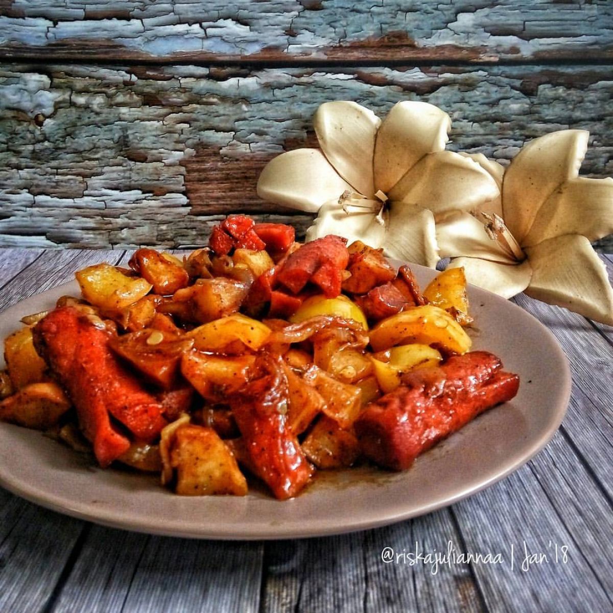 - Masukkan sosis dan kentang yang sudah digoreng sebelumnya. Campur semua bahan hingga meresap bumbu. Cicipi dan koreksi rasa sesuai selera.