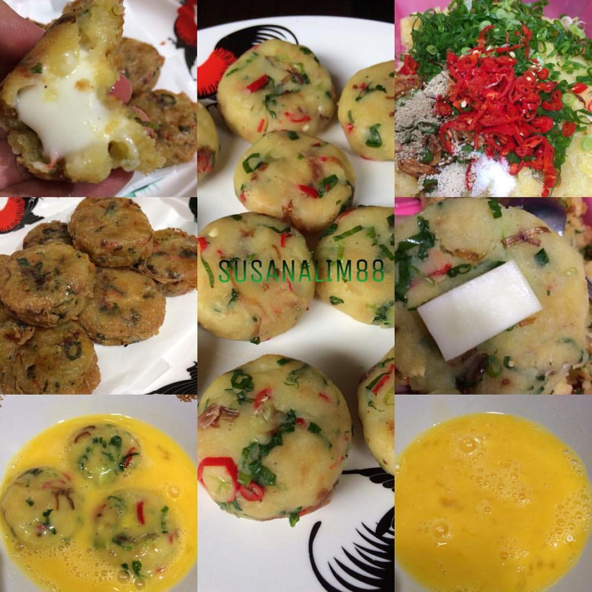 - Masukkan bawang goreng, daun bawang, cabe, garam, merica halus, dan penyedap jamur ke dalam adonan kentang. Aduk hingga semua bahan tercampur rata.