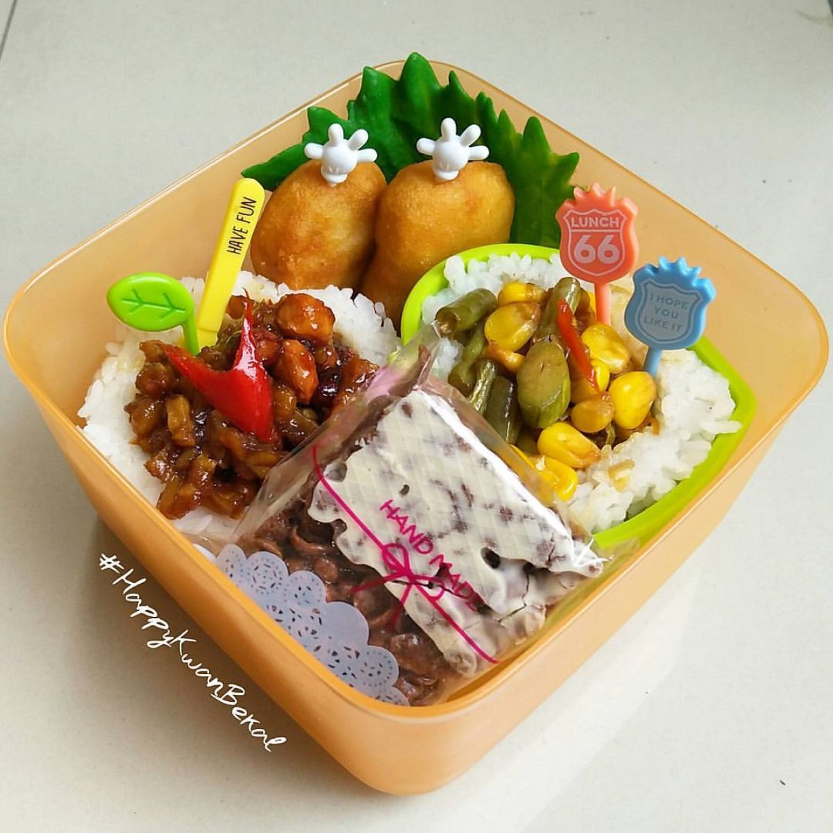 Ambil kotak bekal dan sajikan nasi putih, kering kentang kacang, oseng jagung buncis pete, dan chicken tempura dalam satu porsi. Bekal ini tidak hanya lezat tetapi juga kaya akan nutrisi. Cocok untuk menghemat waktu dan memberikan energi seharian!