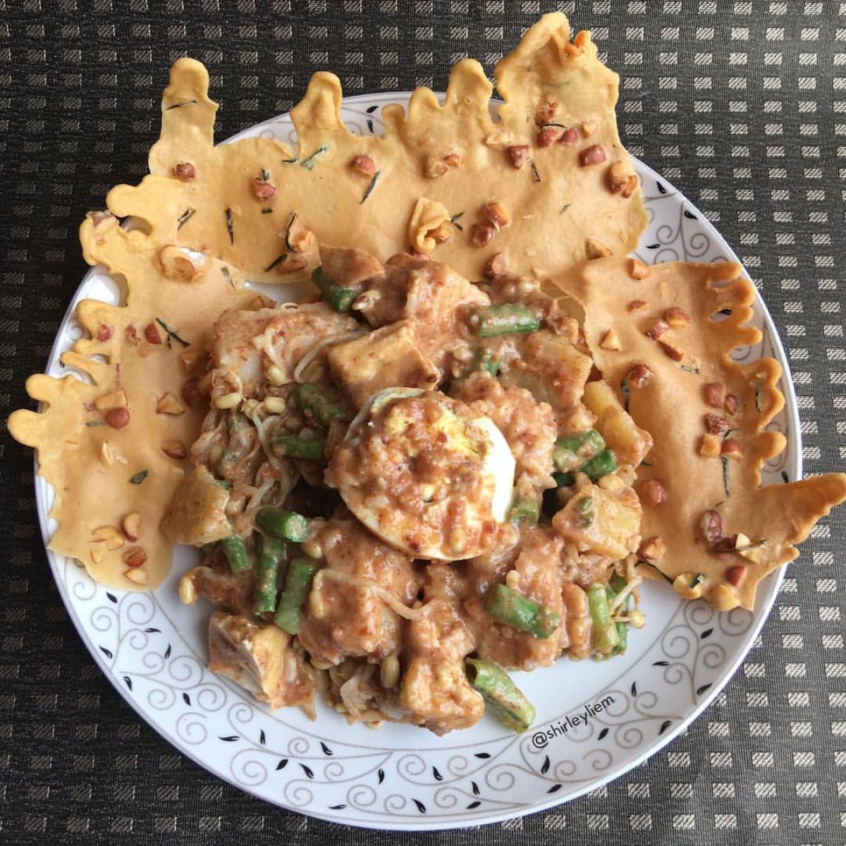 - Tuangkan saus kacang ke atas sayuran dan bahan lainnya. Taburi dengan kerupuk sebagai tambahan tekstur, jika mau.