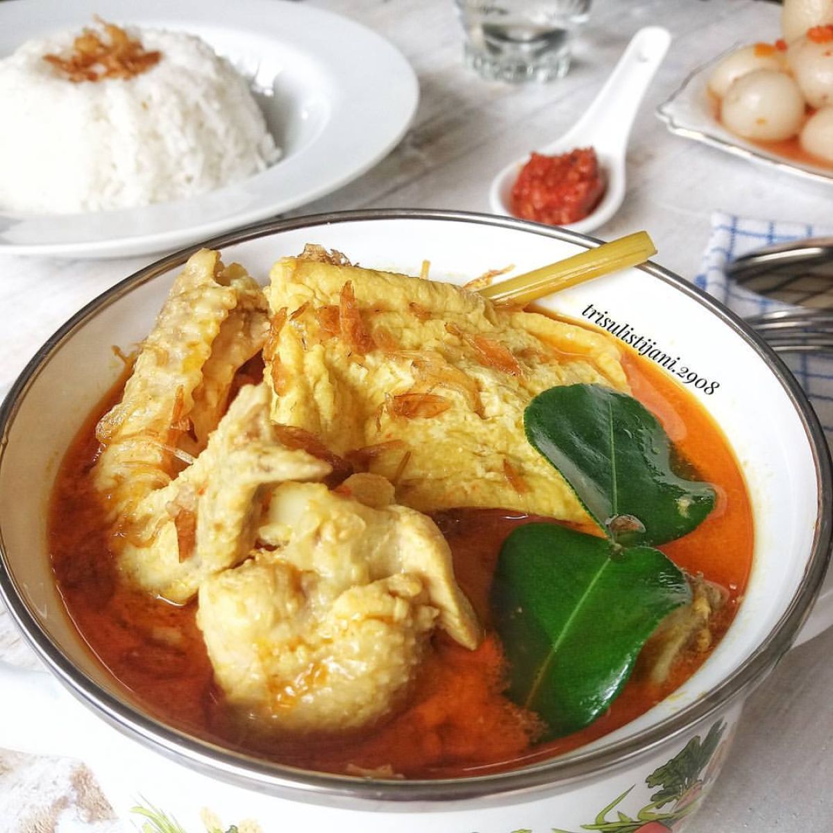 - Kare siap disajikan dengan taburan bawang merah goreng dan sambel bajak di atasnya.