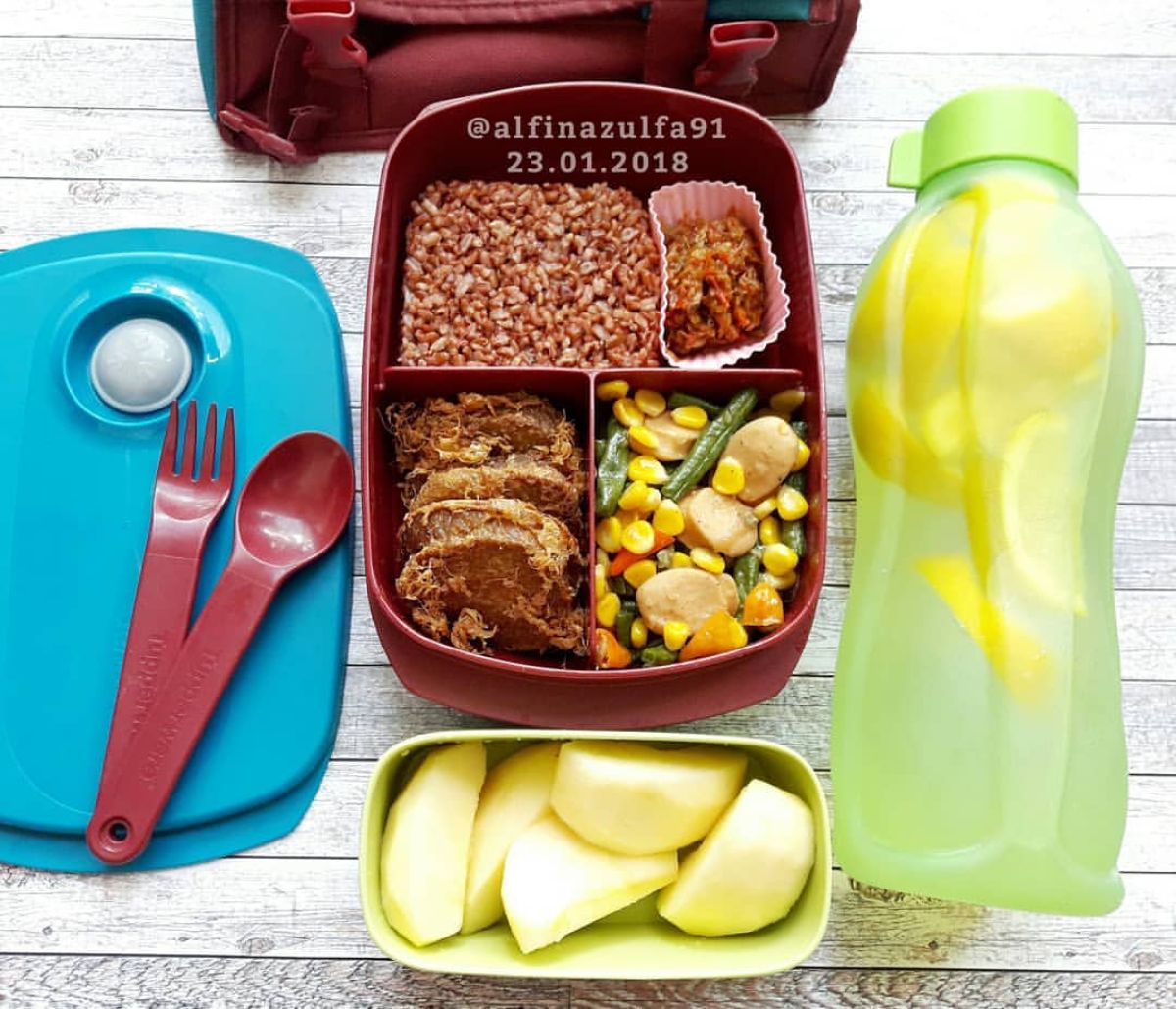 Hari ini kita akan membuat bekal yang sehat dan lezat! Yuk, kita siapkan beberapa bahan untuk bekal kamu. Bekal ini terdiri dari nasi merah, tumis kacang panjang, rolade daging homemade, sambal teri, satu buah apel, dan infused water lemon. Yuk, kita mulai!