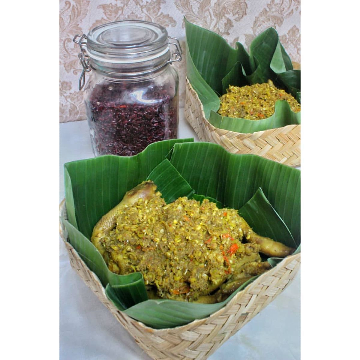 - Gulung ayam dalam daun pisang dan kukus selama 2 jam. Setelah matang, bisa dibakar atau dipanggang sebentar untuk menambah aroma.