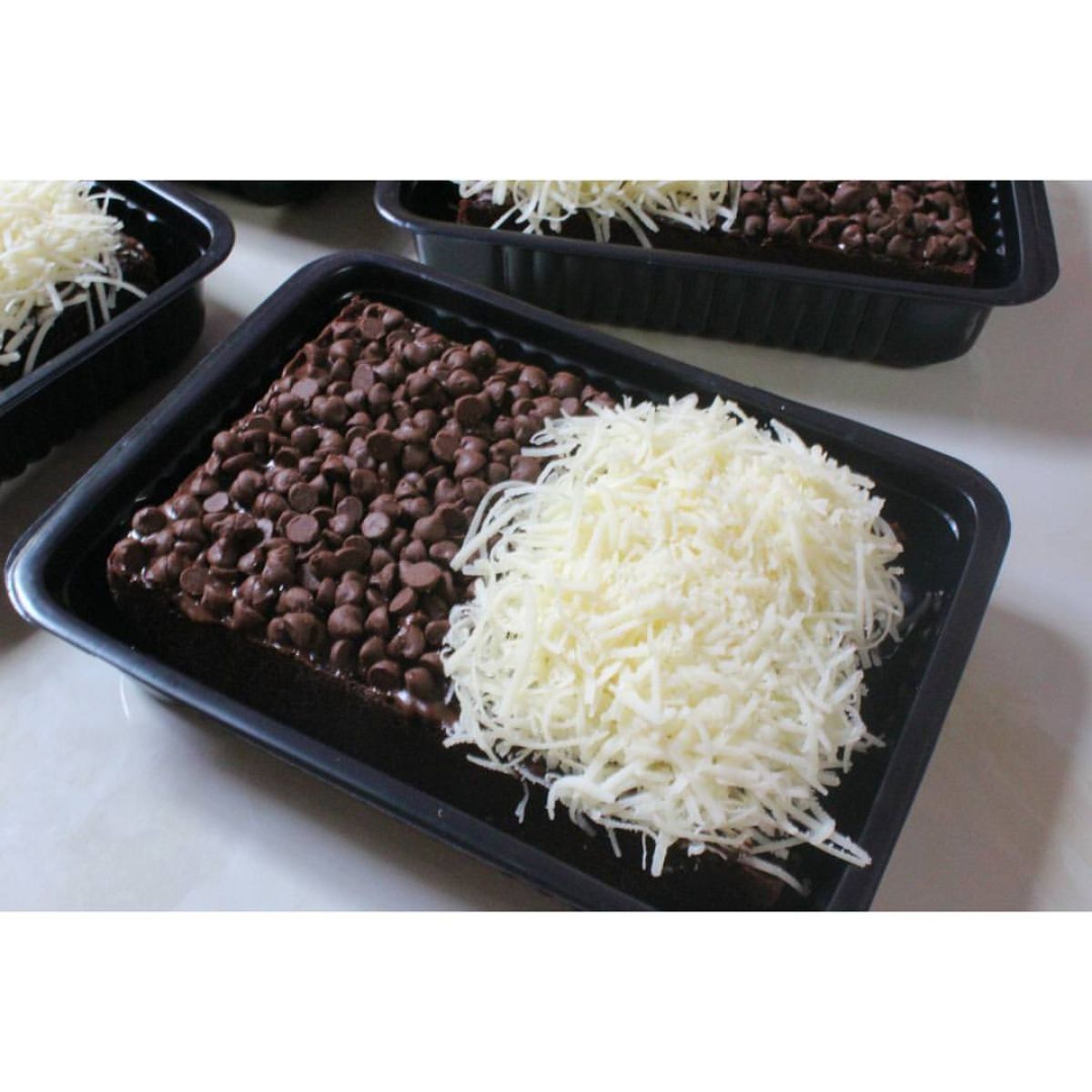 - Tuangkan adonan ke dalam loyang yang sudah disiapkan. Taburkan chocochips atau mesis di atas adonan sesuai pilihan toppingmu.