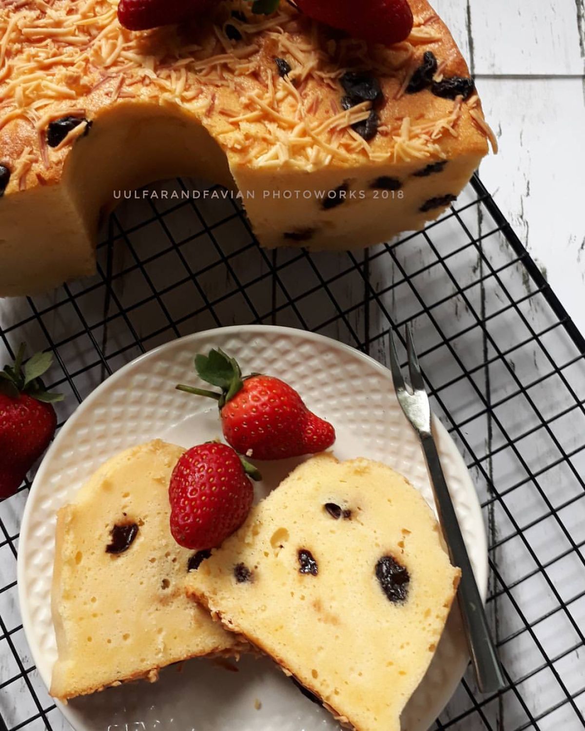 - Tuangkan setengah adonan ke dalam loyang, taburi dengan kismis. Kemudian tuangkan sisa adonan di atasnya dan taburi kismis serta keju parut di atasnya.