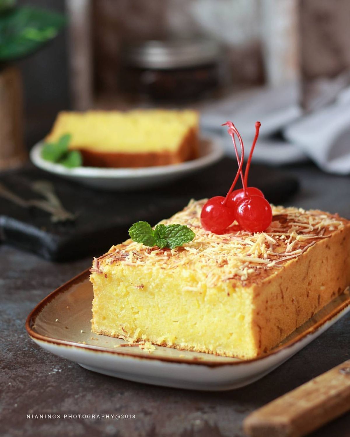 - Setelah matang, keluarkan dari loyang dan dinginkan di cooling rack. Potong kue setelah benar-benar dingin.