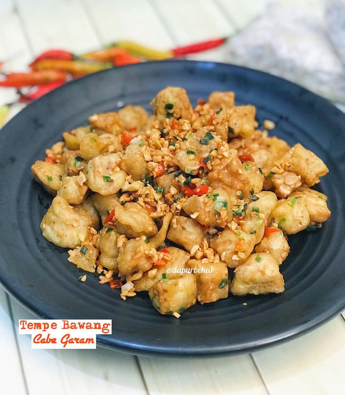 - Selanjutnya, masukkan tempe goreng ke dalam wajan. Aduk perlahan agar tempe tercampur dengan bumbu namun jangan terlalu keras agar tempe tidak hancur. Tempe bawang cabe garam siap disajikan!