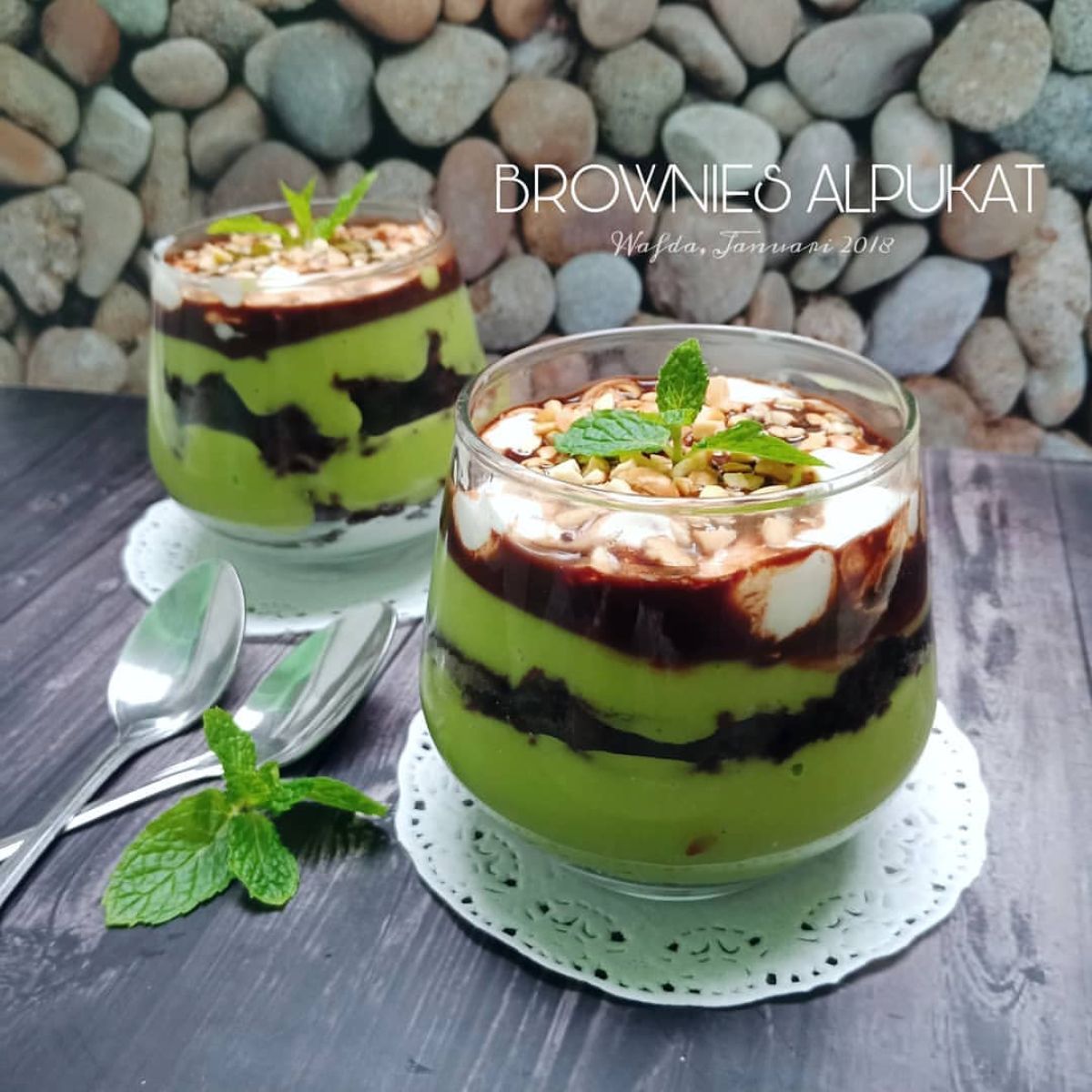 Ambil wadah, letakkan satu lapisan brownies di dasar. Tambahkan avocado vla di atasnya, kemudian lapisi lagi dengan brownies, dan tambahkan lagi avocado vla. Setelah itu, tambahkan whipped cream dan tuangkan ganache di atasnya. Untuk sentuhan terakhir, kamu bisa menambahkan topping sesuai selera seperti kacang atau buah-buahan. Simpan dalam lemari es selama kurang lebih 30 menit, lalu sajikan dingin.