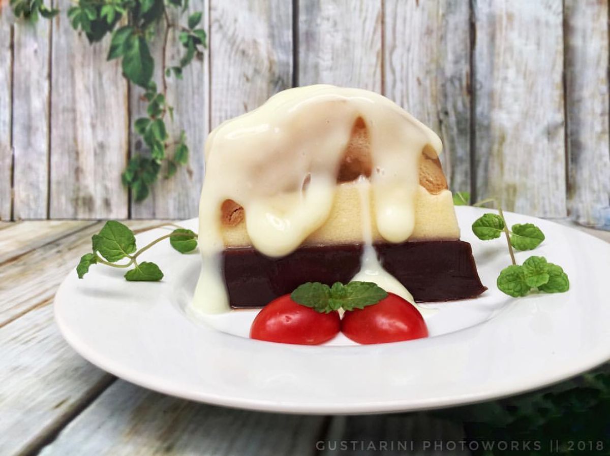 Masak agar-agar, gula pasir, dan air sambil terus diaduk. Ambil sedikit adonan untuk melarutkan coklat bubuk. Gabungkan larutan coklat ke dalam panci, masak hingga mendidih. Setelah itu, tuangkan perlahan ke atas lapisan putih yang sudah set. Dinginkan dan masukkan ke kulkas.
