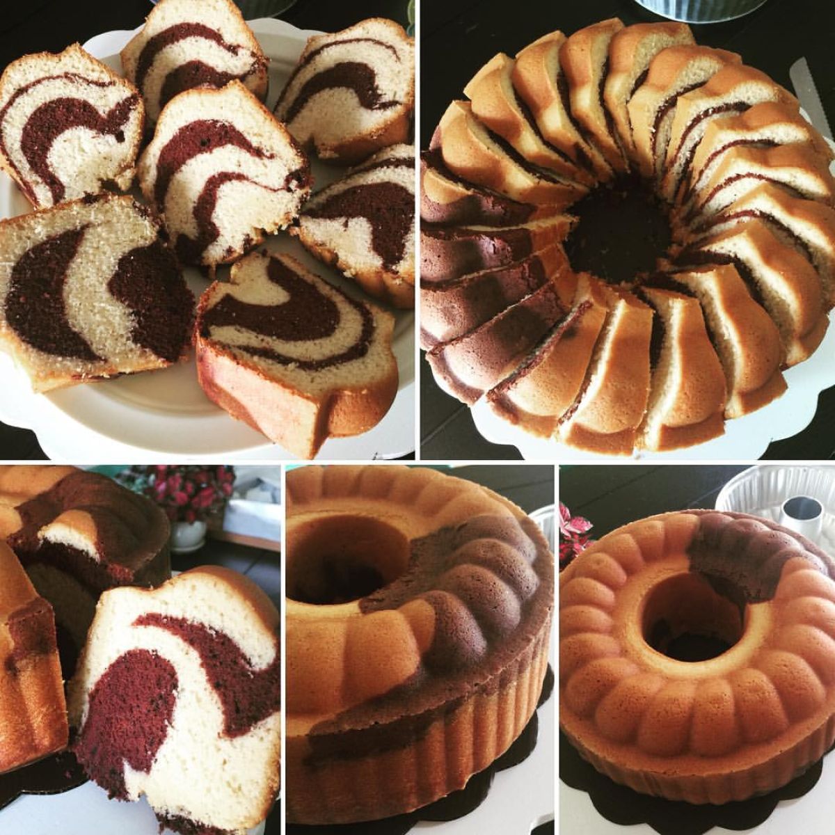 - Siapkan loyang yang sudah diolesi mentega dan ditaburi sedikit tepung. Tuangkan adonan putih dan cokelat secara bergantian ke dalam loyang untuk menciptakan motif marmer.