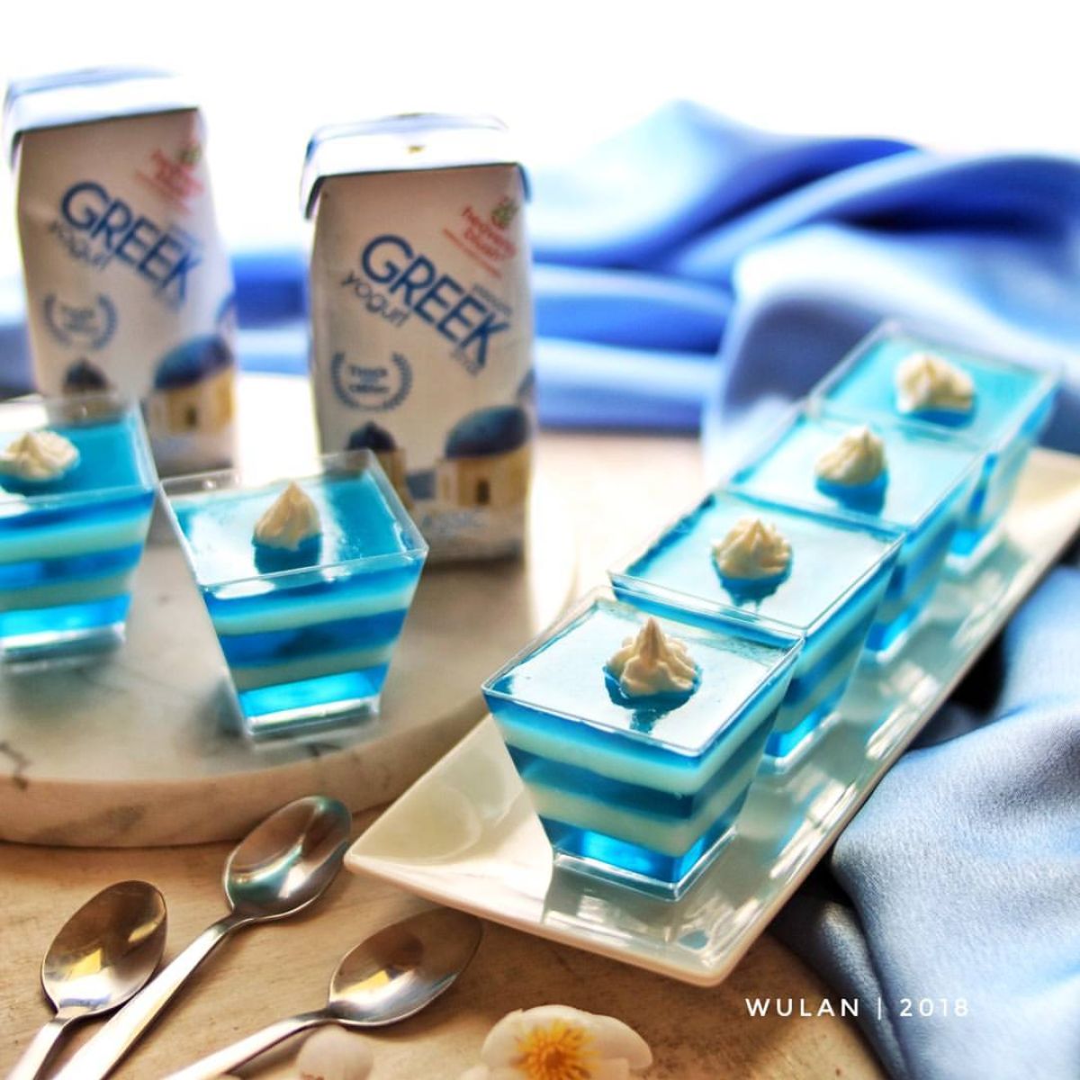 - Siapkan loyang atau cetakan sesuai selera. Tuang campuran jely berwarna biru ke dalam loyang terlebih dahulu, diikuti dengan campuran yogurt. Biarkan sampai puding set.