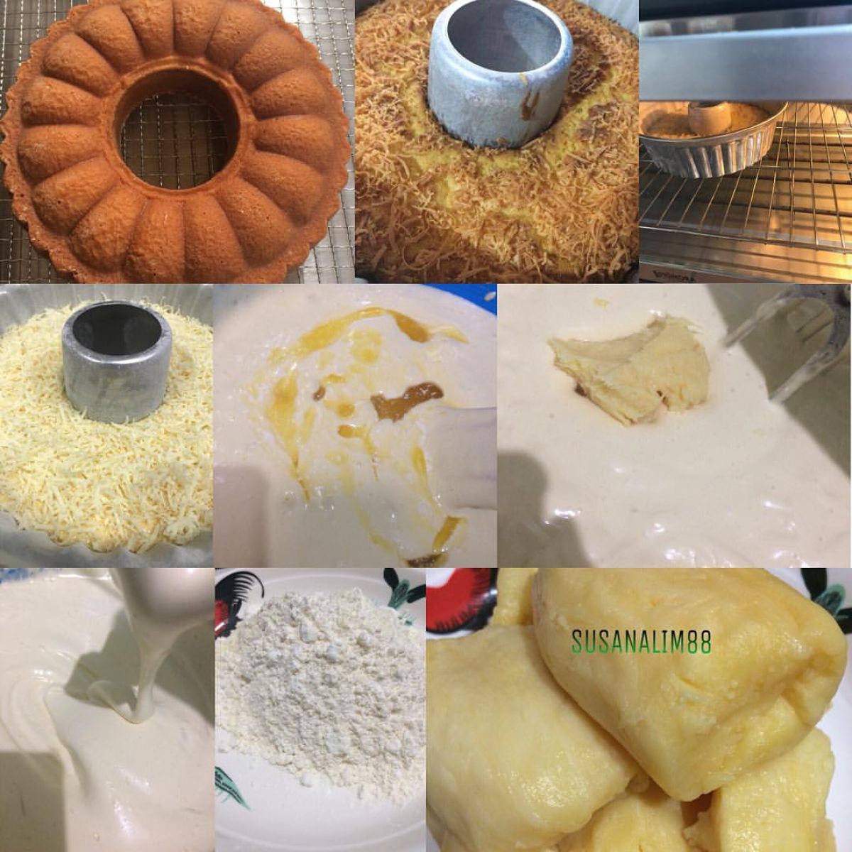 - Tuang adonan ke dalam loyang yang sudah disiapkan. Taburi dengan keju cheddar parut di atasnya.