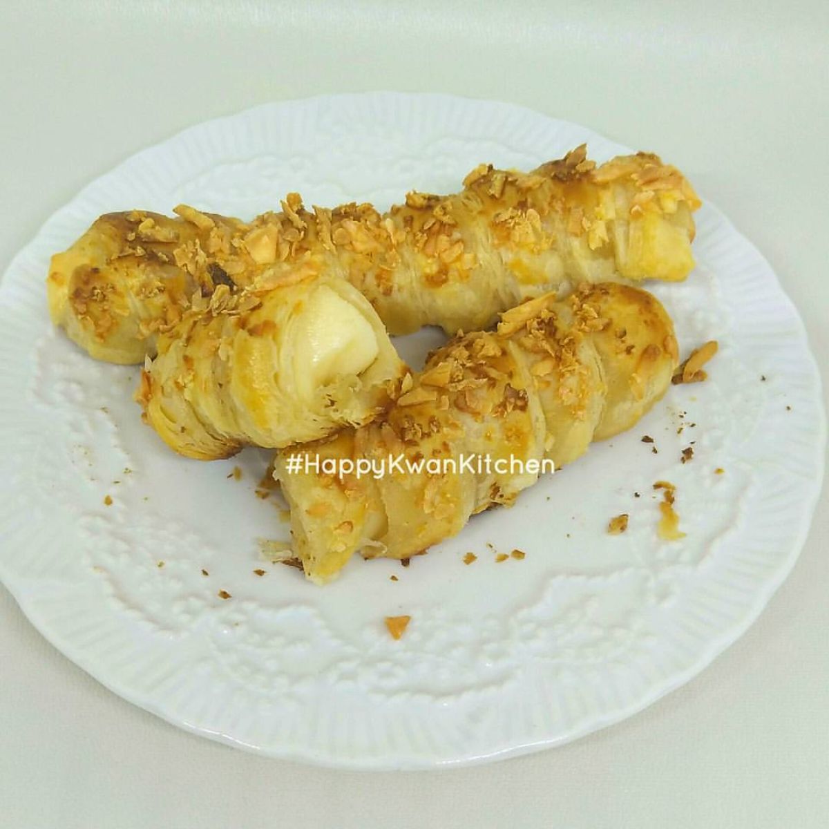 - Ambil satu lembar puff pastry, letakkan potongan keju di tepi lembaran pastry, dan gulung pastry tersebut hingga melilit keju.