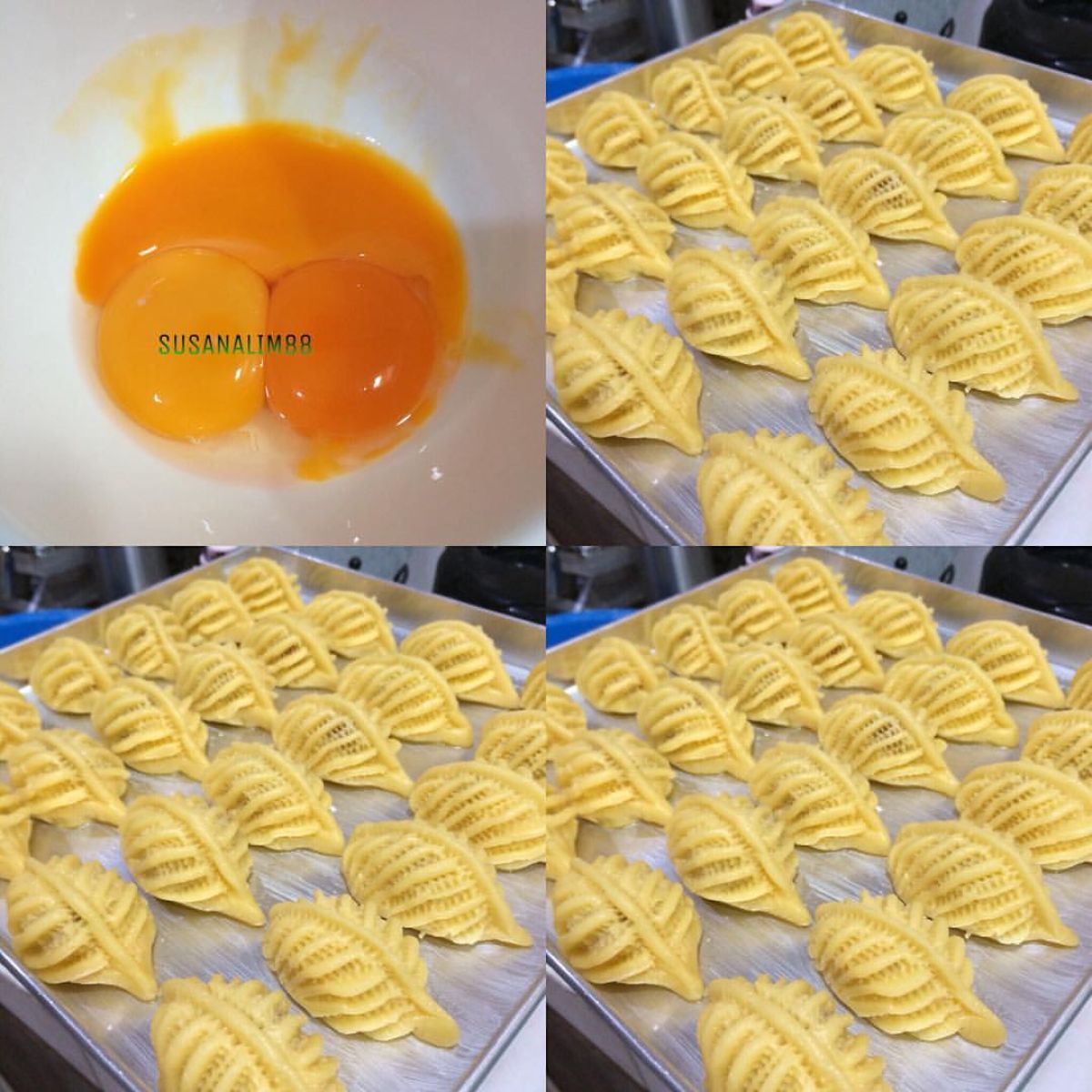 - Kocok butter, gula halus, dan 2 butir kuning telur menggunakan mixer dengan kecepatan rendah selama 1 menit, sampai semua bahan tercampur rata.