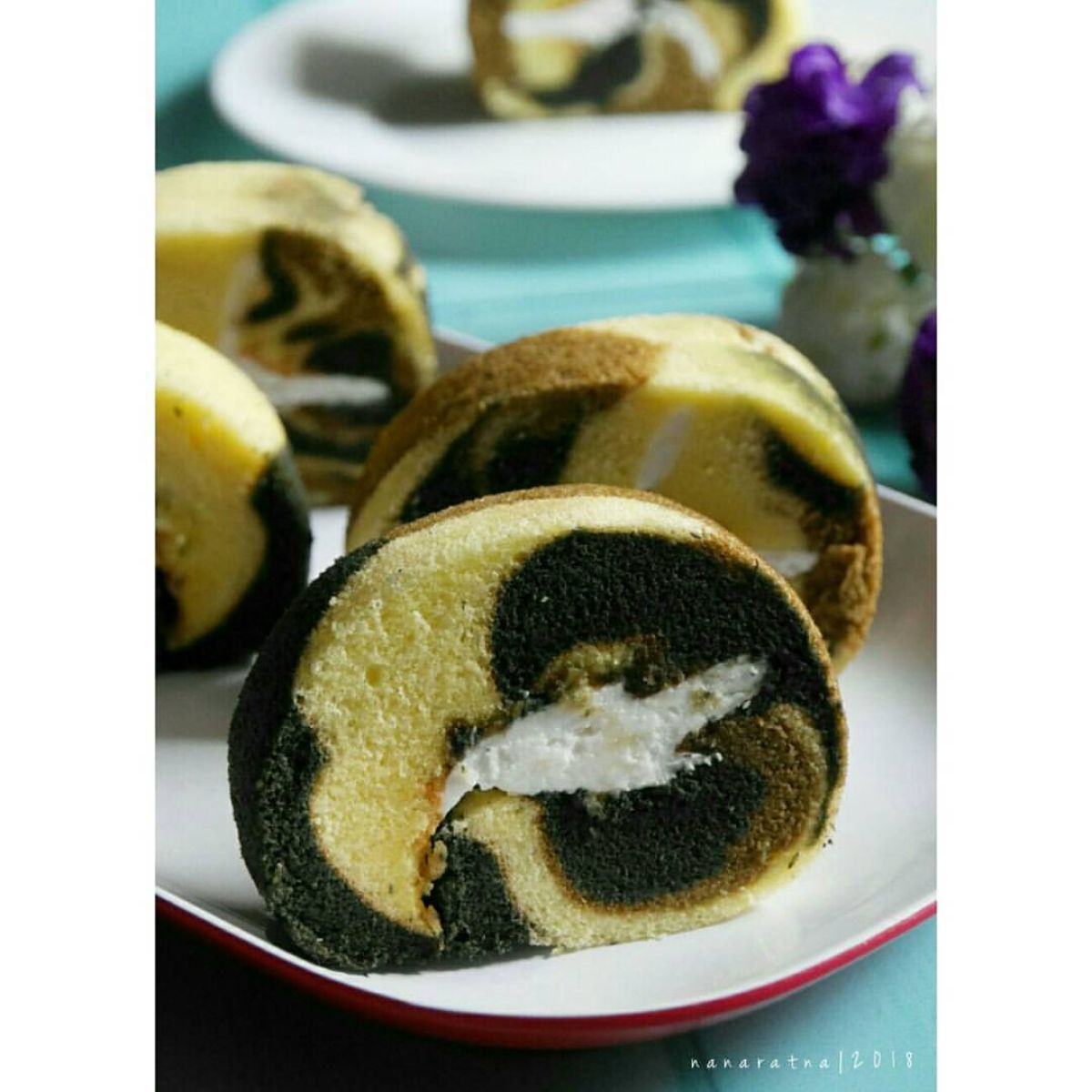 - Setelah matang, keluarkan dari loyang dan biarkan dingin. Setelah dingin, beri isian buttercream pada permukaan kue, lalu gulung perlahan sambil dipadatkan agar membentuk rol yang rapat.
