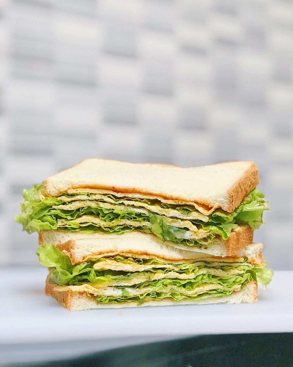 - Tambahkan potongan telur dadar di atas selada, lalu tambahkan selada lagi. Ulangi langkah ini hingga bahan habis, sesuaikan dengan jumlah roti.