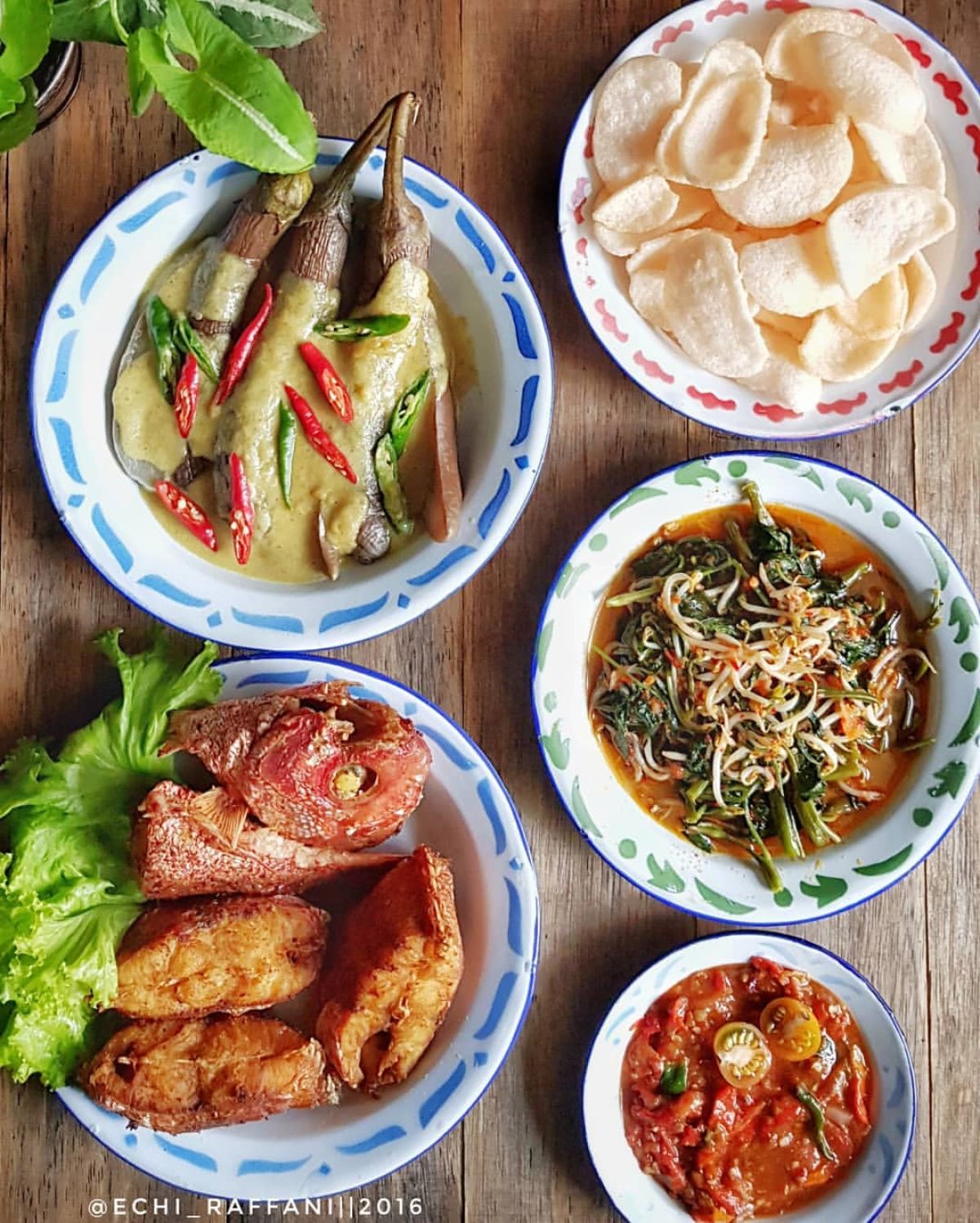 5. Penyajian: Siapkan piring saji, letakkan terong dengan kuah opor, tambahkan ikan kakap goreng dan tumis kangkung. Sajikan dengan sambal dan kerupuk di sampingnya.